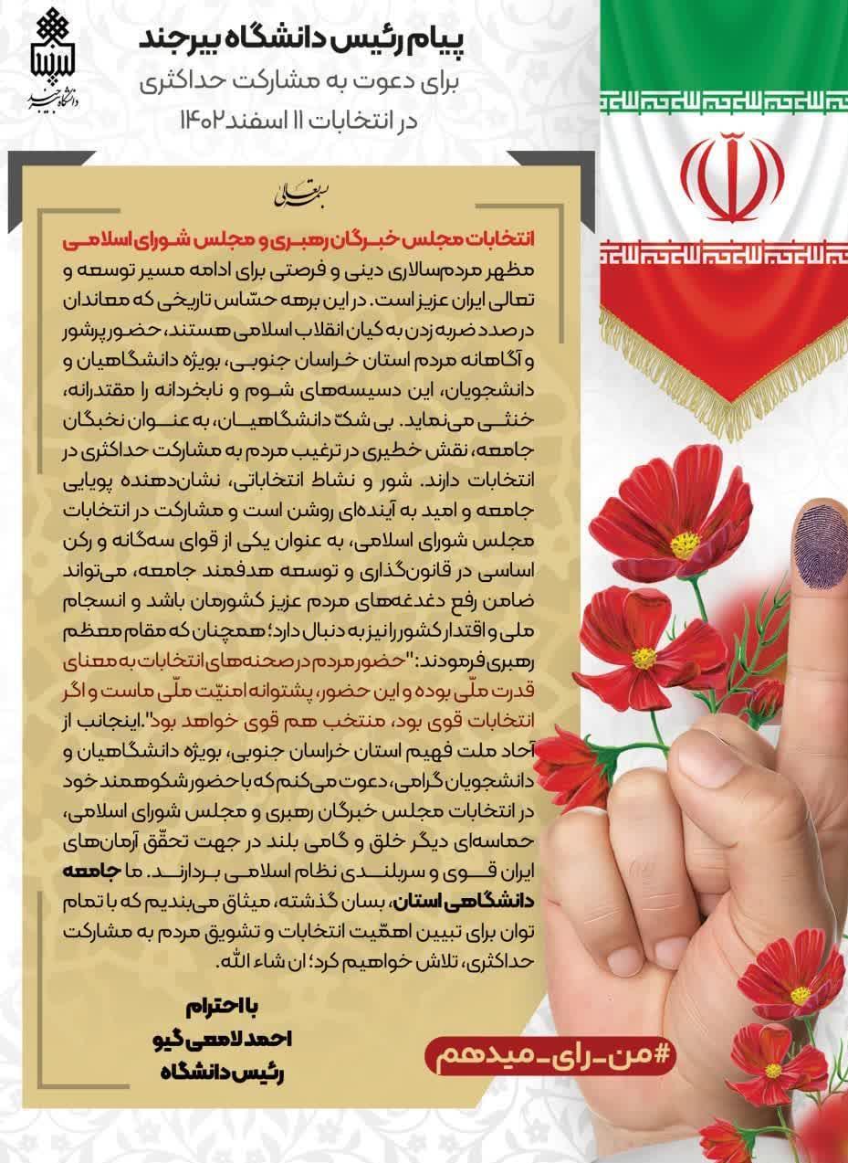 پیام رئیس دانشگاه بیرجند مبنی بر دعوت به مشارکت پرشور و حداکثری در انتخابات ۱۱ اسفند ۱۰ اسفند ۱۴۰۲ | ۲۱:۰۷ کد : ۲۷۱۰۸ اخبار برگزیده ارسال به دیگران نام شما ایمیل شما ایمیل دریافتکننده ارسال انصراف تعداد بازدید:۴۳۱۵