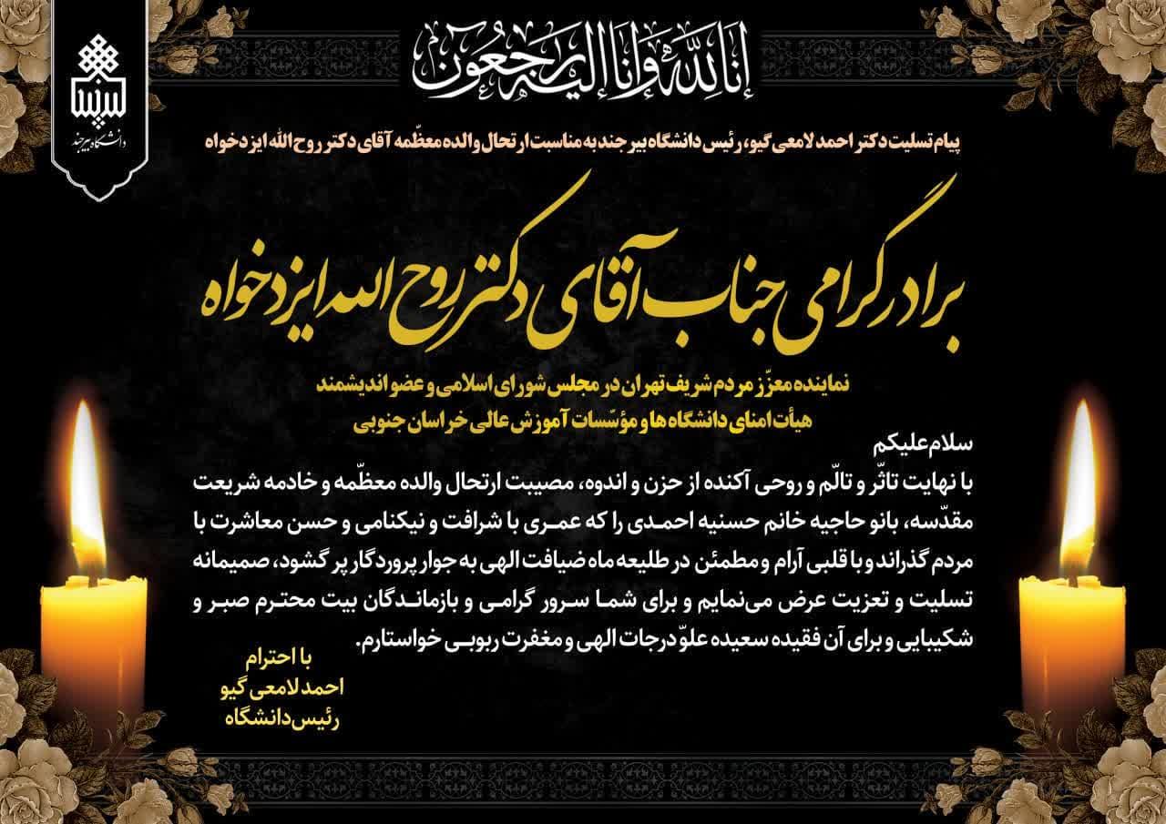 پیام رئیس دانشگاه بیرجند به مناسبت ارتحال والده معظّمه آقای دکتر روح الله ایزدخواه