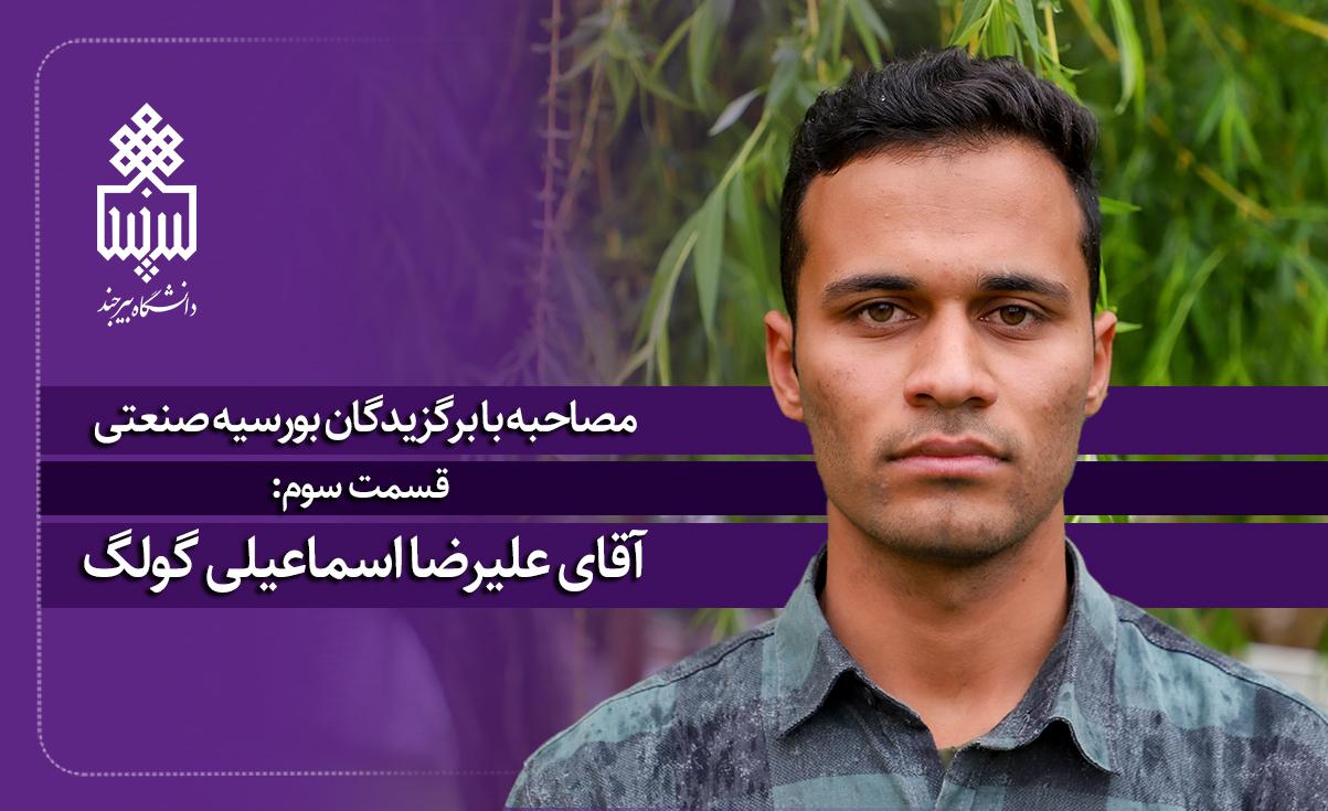 سومین بخش از دیدار با بورسیه شدگان صنعتی دانشگاه بیرجند، به آقای علیرضا اسماعیلی گولگ، متولد شهرستان خوسف اختصاص دارد، ایشان تحصیلات دبیرستان را در رشته علوم تجربی گذرانده و هم اکنون در رشته زمین شناسی (بورسیه صنعتی) دانشگاه بیرجند مشغول به تحصیل می باشد. وی در دوران تحصیل علاوه بر درس، در رشته ورزشی دوومیدانی مشغول فعالیت بوده و در این زمینه دارای عناوین شهرستانی نیز می باشد. از او در خصوص بورسیه صنعتی دانشگاه بیرجند پرسیدیم.