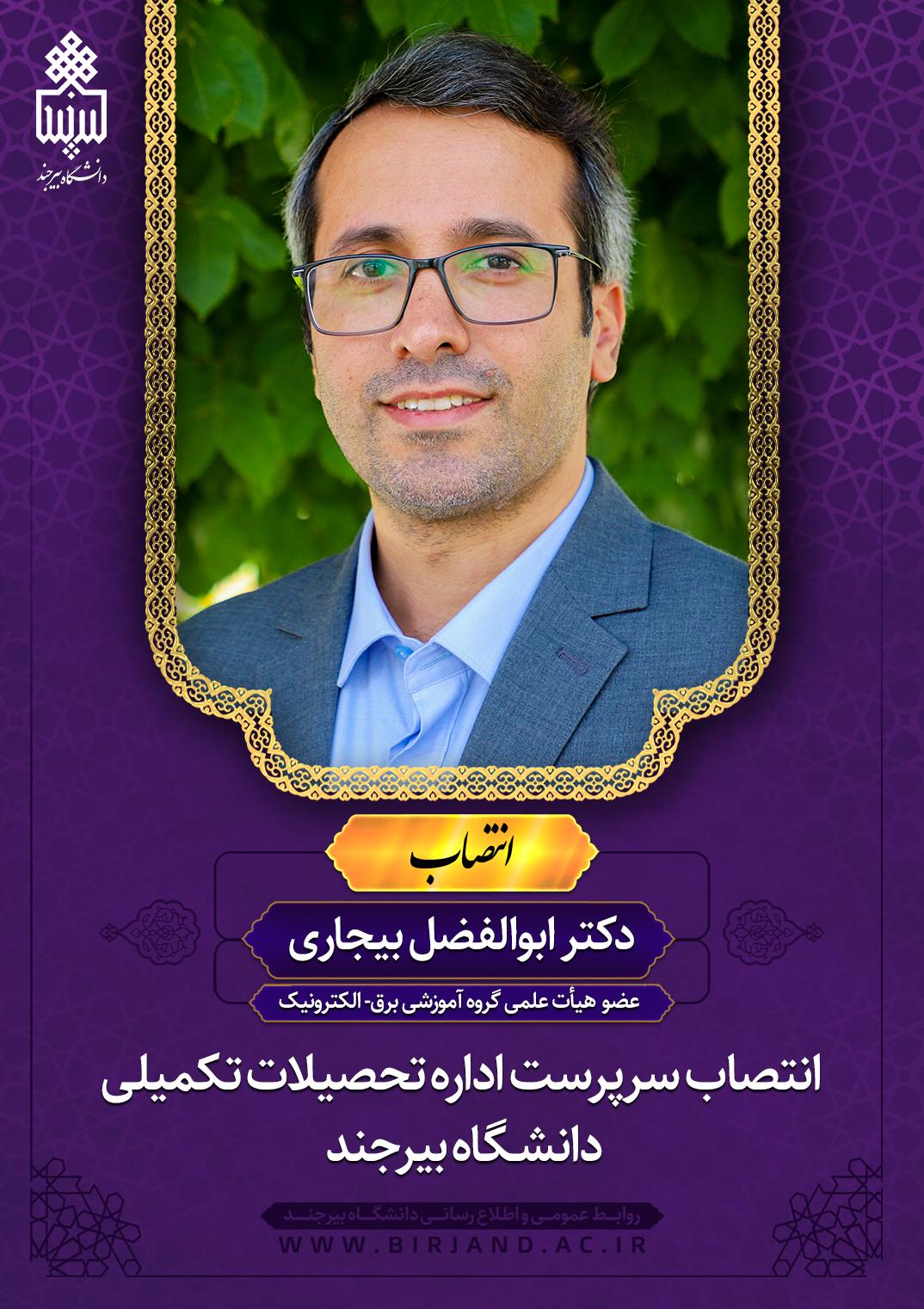 به گزارش روابط عمومی و اطلاعرسانی دانشگاه بیرجند، در ابلاغ صادره از سوی رئیس دانشگاه آمده است؛ نظر به مراتب تعهد، تجارب و شایسـتگیهای علمی و اجرایی جنابعالی، بنا به پیشـنهاد معاون محترم آموزشی و تحصیلات تکمیلی، به موجب این ابلاغ و با حفظ سـمت آموزشـی و پژوهشی، به عنوان سرپرست اداره تحصیلات تکمیلی دانشگاه منصوب میشوید. اطمینان دارم با اتکال به خداونـد سـبحان و بهرهگیری از مشارکت و همفکری همکاران دانشـگاهی، منشاء خـدمات ارزندهای خواهید بود.