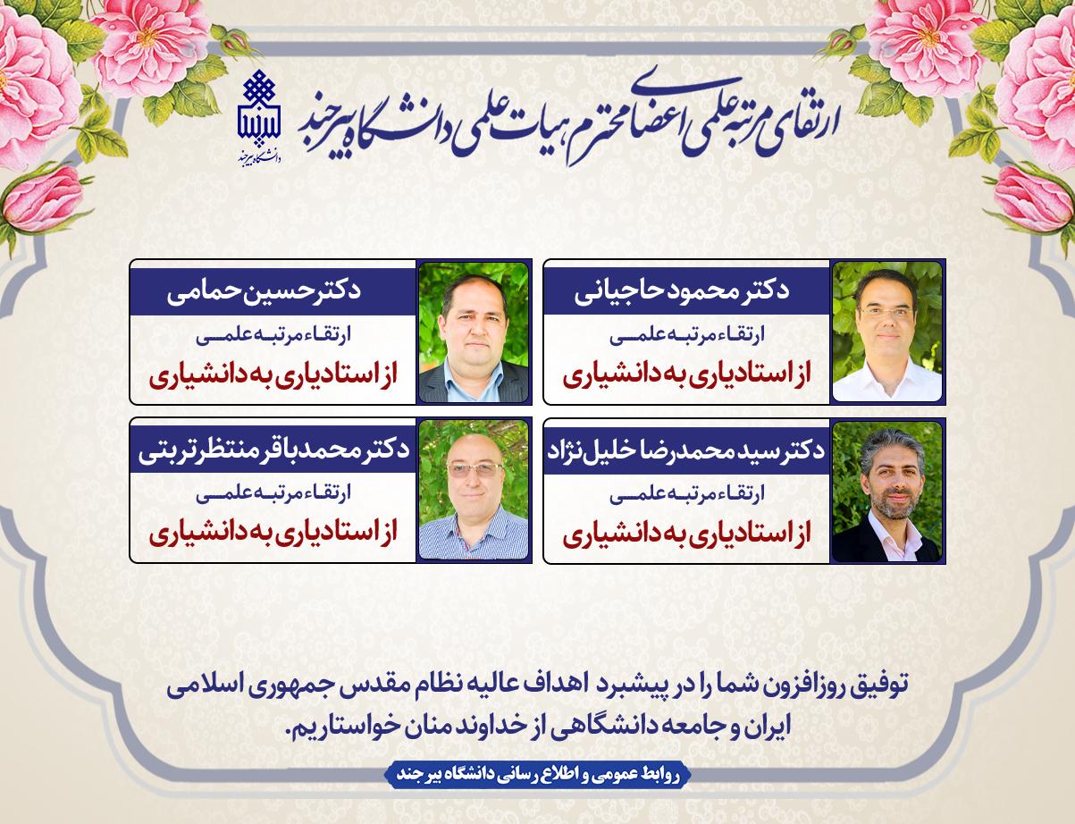 روابط عمومی و اطلاعرسانی دانشگاه بیرجند ضمن تبریک به جامعه دانشگاهی، از خداوند متعال برای این اساتید محترم و فرهیخته آرزوی توفیق روز افزون و تداوم موفقیتها در کسب درجات علمی بالاتر را خواستار است.