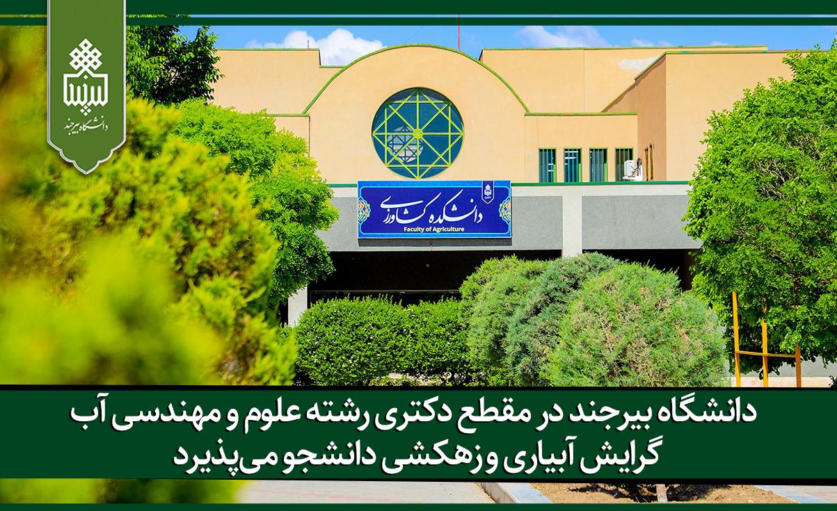 دانشگاه بیرجند در مقطع دکتری رشته علوم و مهندسی آب گرایش آبیاری و زهکشی دانشجو میپذیرد