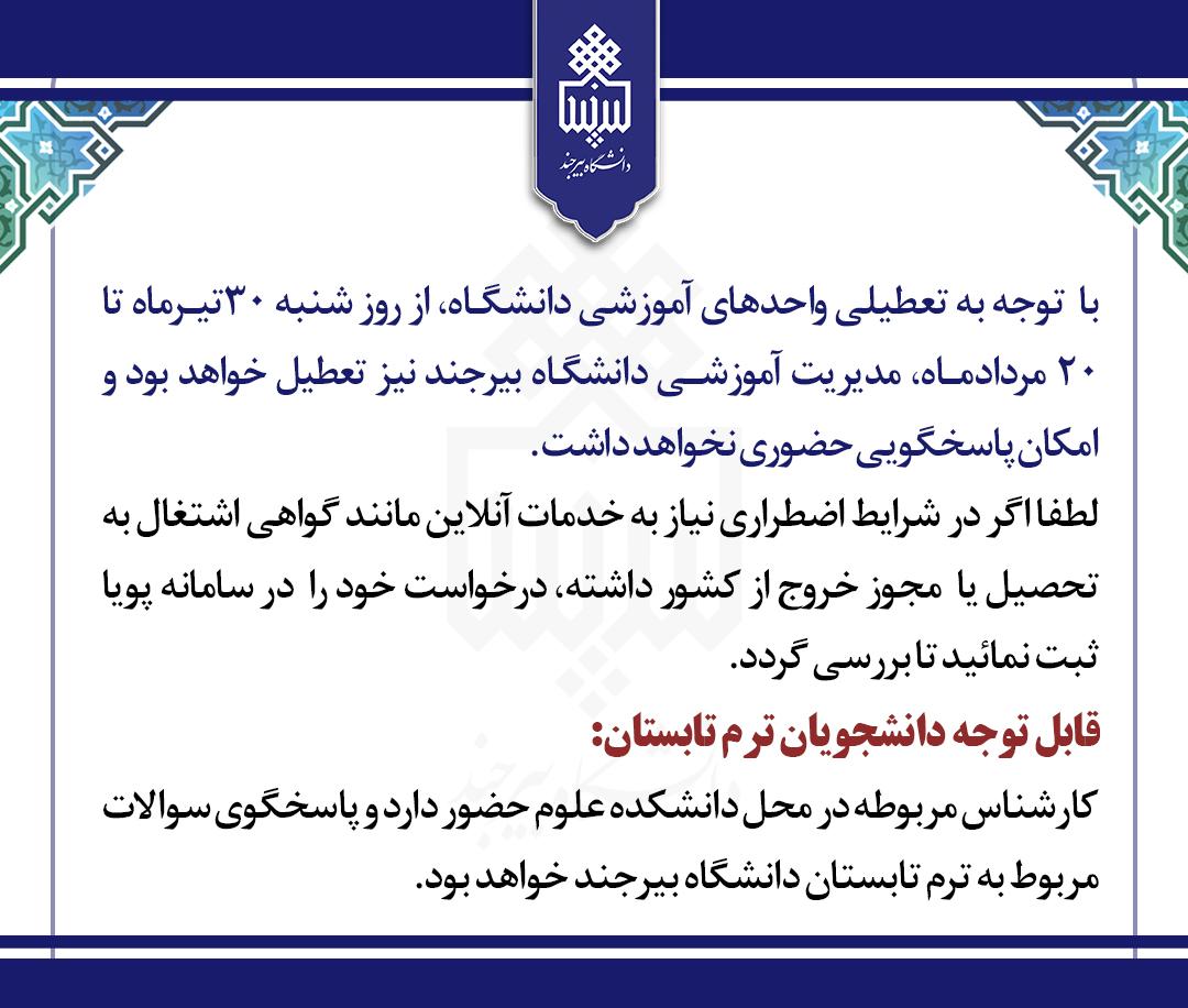 باتوجه به تعطیلی واحدهای آموزشی دانشگاه، از روز شنبه 30تیرماه تا 20 مردادماه، مدیریت آموزشی دانشگاه نیز تعطیل خواهد بود و امکان پاسخگویی حضوری نخواهد داشت.