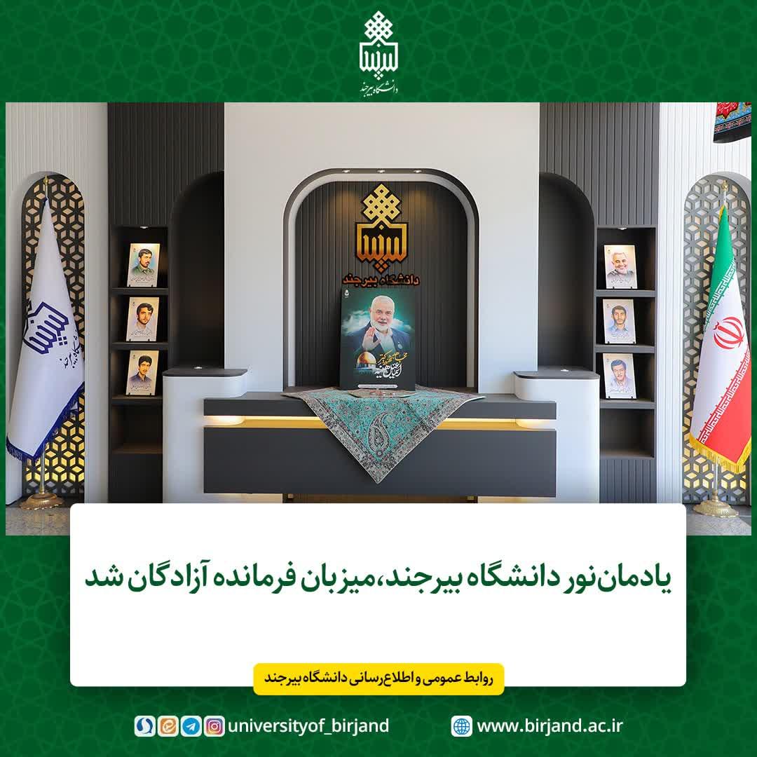 به گزارش روابط عمومی و اطلاعرسانی دانشگاه بیرجند، طرح دکوراسیون دیوار یادبود شهدای دانشجوی دانشگاه بیرجند موسوم به دیوار «یاد نور» در لابی سازمان مرکزی میزبان تمثال شهید اسماعیل هنیه گردید تا هم ادای احترامی باشد به یاد و خاطره این شهید والامقام که در حریم مقدس جمهوری اسلامی ایران به شهادت رسید و هم بر پیوند شهدای جبهه مقاومت و شهدای دانشجو به عنوان راهنمایان و مشعل داران مسیر آگاهی و دانش تاکید شود.