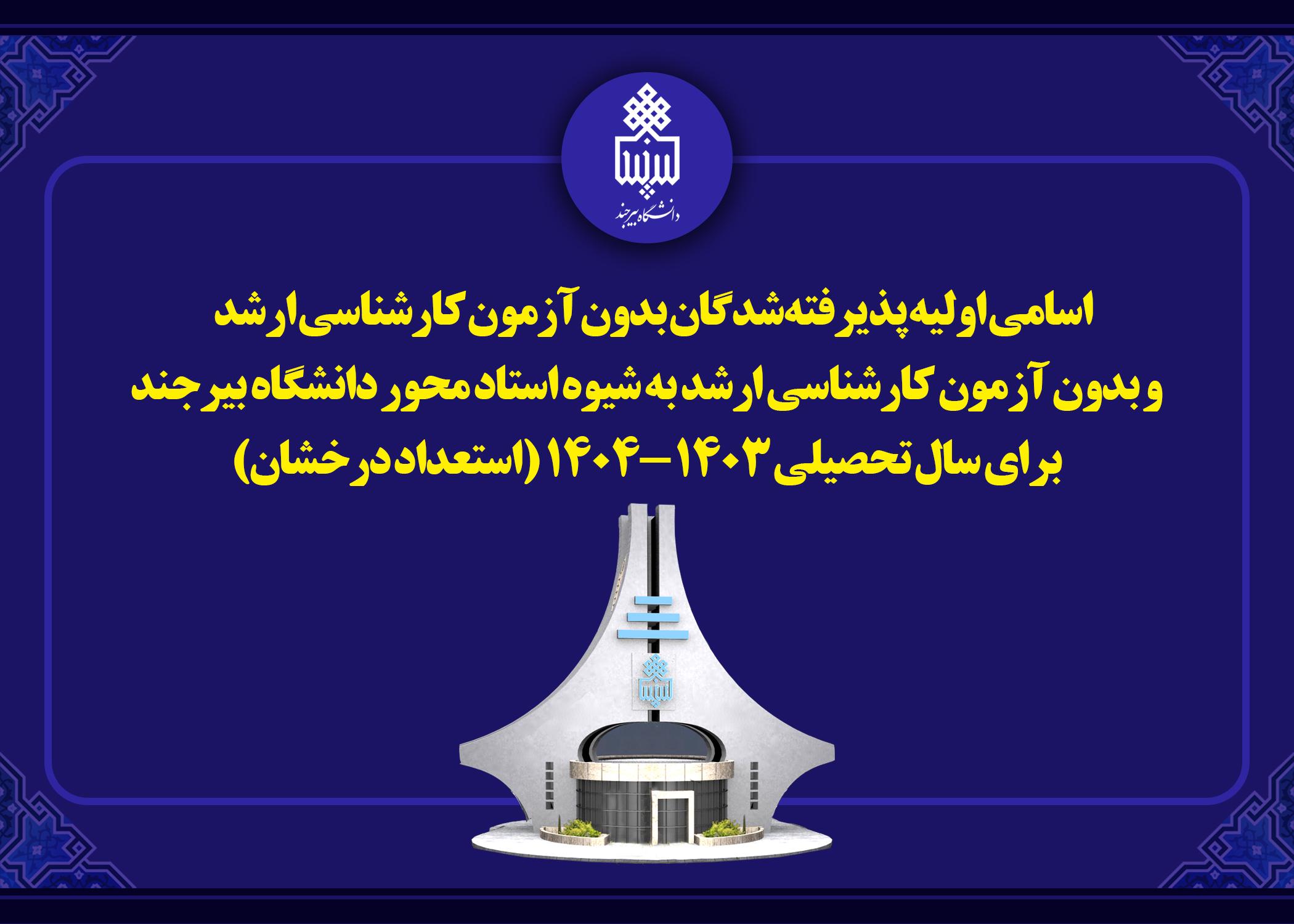 اسامی اولیه پذیرفته‌شدگان بدون آزمون کارشناسی ارشد و بدون آزمون کارشناسی ارشد به شیوه استاد محور دانشگاه بیرجند برای سال تحصیلی ۱۴۰۳-۱۴۰۴ (استعداد درخشان)