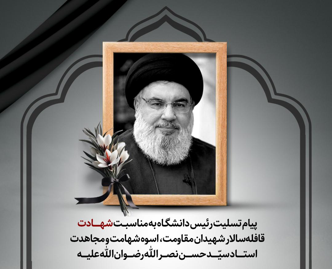 پیام تسلیت رئیس دانشگاه به مناسبت شهادت قافلهسالار شهیدان مقاومت، اسوه شهامت و مجاهدت، استاد سیّد حسن نصرالله رضوانالله علیه