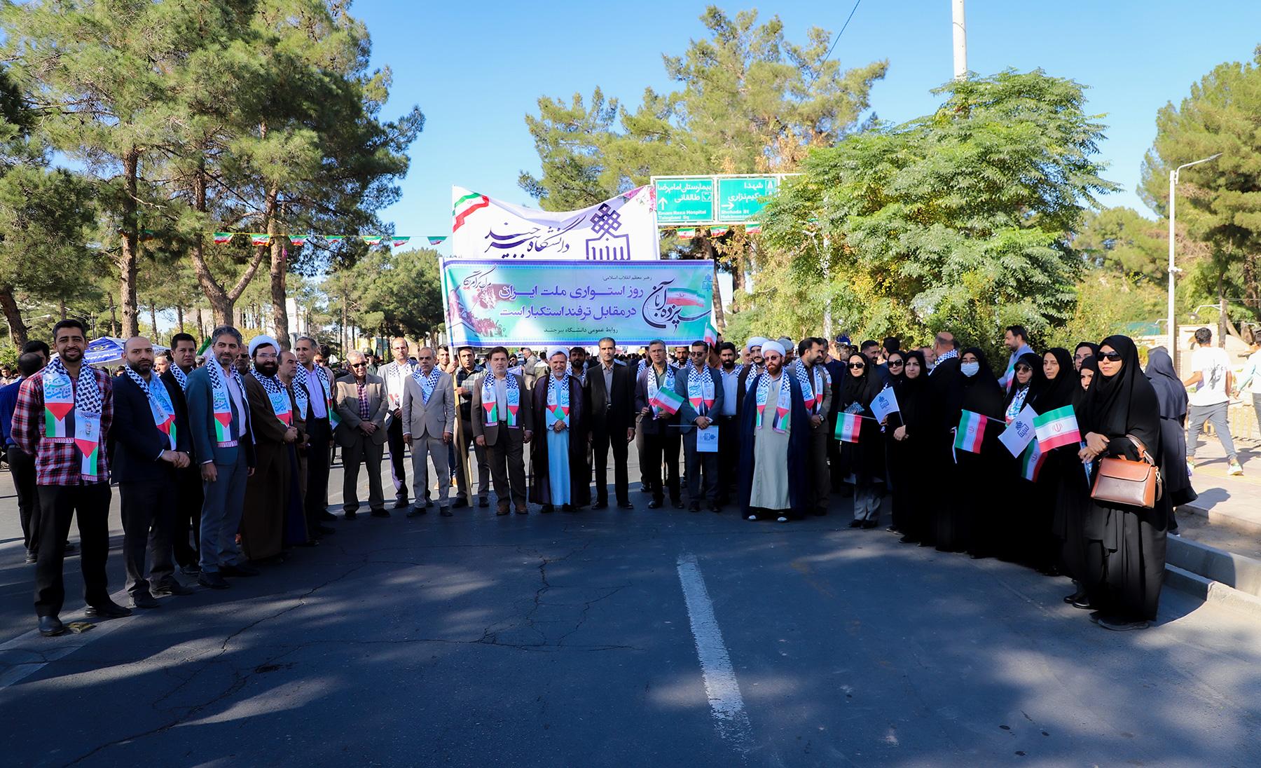 به گزارش روابط عمومی و اطلاعرسانی دانشگاه بیرجند، دانشجویان، اعضای هیأت علمی و کارمندان دانشگاه بیرجند با حضور و بصیرتی مثال زدنی در یوم الله سیزدهم آبان با شعار مرگ بر آمریکا از استکبار جهانی و رژیم جعلی اسرائیل اعلام انزجار کردند.