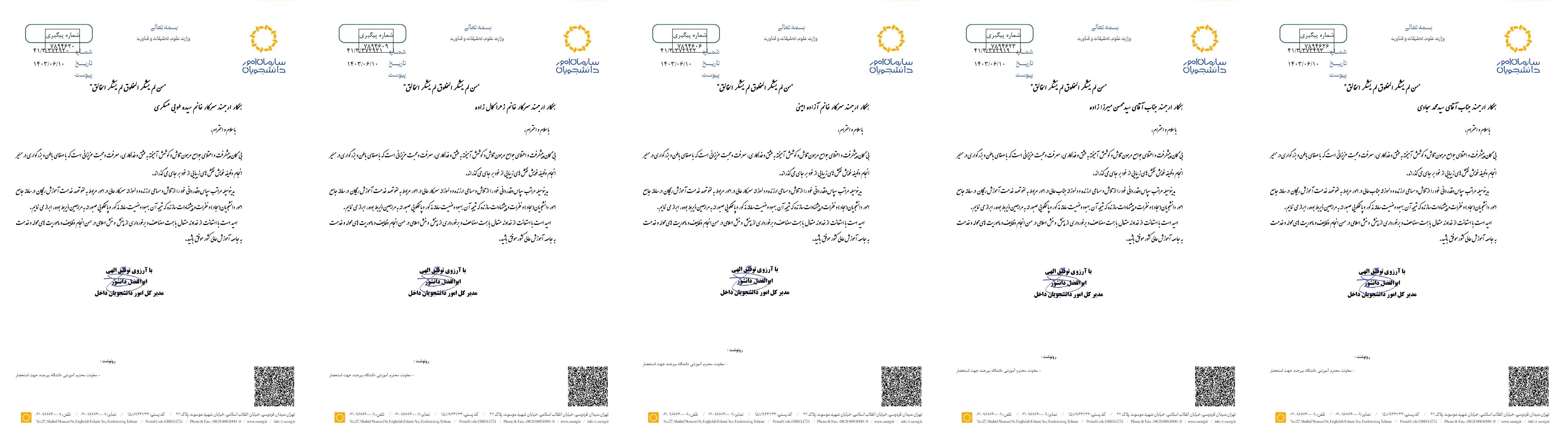 در این نامه‌ها، دکتر دانشور از تلاش‌های دلسوزانه و مساعی کارشناسان اداره دانش‌آموختگان دانشگاه بیرجند، آزاده امینی، سیدمحسن میرزاده، سیده طوبی عسکری، زهرا کمال زاده و سیدمحمد سجادی، در امور مربوط به لغو تعهد رایگان در سامانه جامع امور دانشجویان (سجاد) قدردانی کرد. وی با اشاره به نظرات و پیشنهادات سازنده این کارشناسان، اظهار داشت که نتیجه این تلاش‌ها به بهبود وضعیت سامانه سجاد در پاسخگویی به مراجعین منجر شده است. دکتر دانشور با تاکید بر اهمیت همکاری و تلاش‌های مستمر همکاران در ارتقاء کیفیت خدمات، از تمامی کارشناسان این حوزه تقدیر و تشکر نمود.