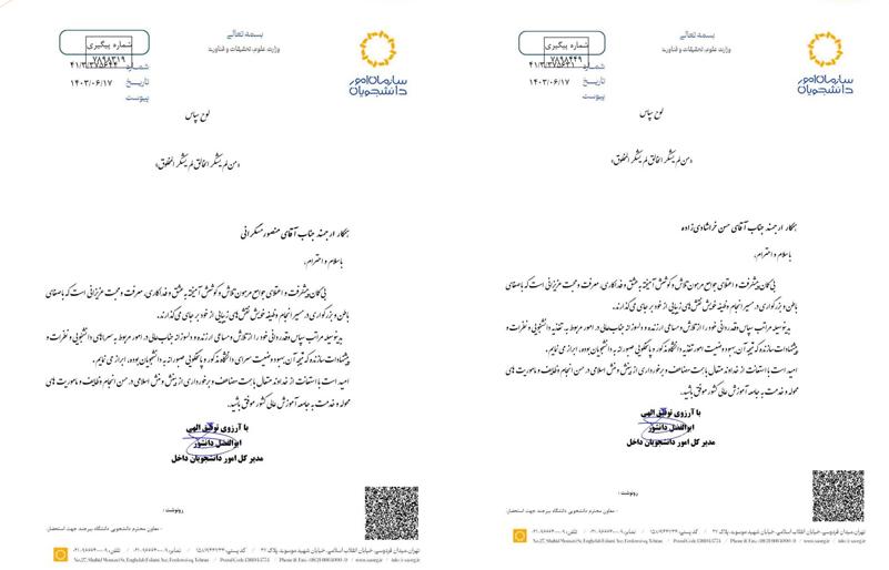 در این نامهها، دکتر دانشور از تلاشهای دلسوزانه و مساعی، حسن خراشادیزاده، رئیس اداره تغذیه دانشگاه بیرجند و منصور مسگرانی، کارشناس امور دانشجویی دانشگاه بیرجند در امور مربوط به سراهای دانشجویی قدردانی کرد.