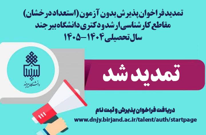 تمدید فراخوان پذیرش بدون آزمون (استعداد درخشان) مقاطع کارشناسی ارشد و دکتری دانشگاه بیرجند برای سال تحصیلی ۱۴۰۴-۱۴۰۵