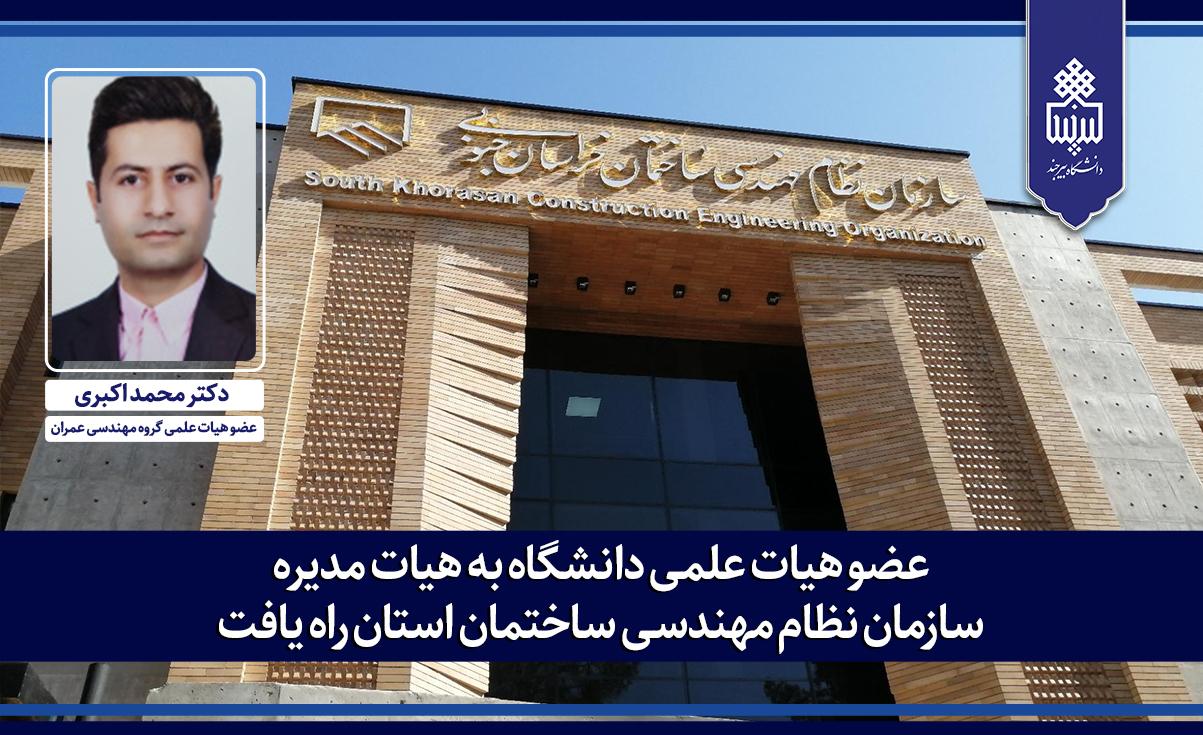 به گزارش روابط عمومی و اطلاعرسانی دانشگاه بیرجند، در دهمین دوره انتخابات هیات مدیره سازمان نظام مهندسی ساختمان استان خراسان جنوبی، دکتر محمد اکبری، رئیس گروه کارآفرینی و ارتباط با جامعه و صنعت دانشگاه و عضو هیات علمی گروه مهندسی عمران دانشگاه، با کسب ۱۱۷۵ رأی به عنوان عضو اصلی هیات مدیره سازمان نظام مهندسی ساختمان استان برای یک دوره سه ساله انتخاب شد.