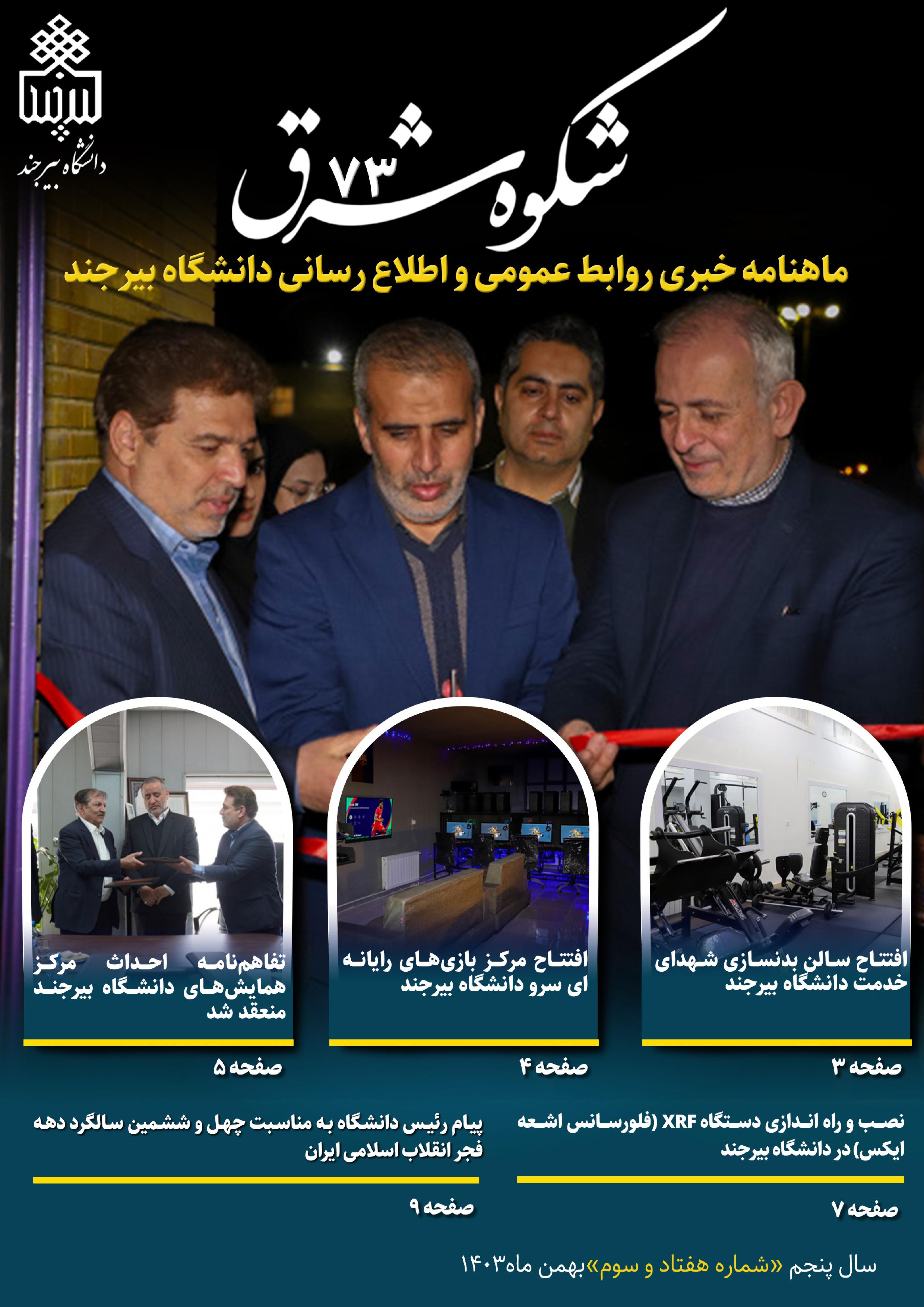 انتشار هفتاد و سومین خبرنامه شکوه شرق ۲۲ اسفند ۱۴۰۳ | ۱۱:۲۷ کد : ۳۰۳۹۹ اخبار ستادی ارسال به دیگران نام شما ایمیل شما ایمیل دریافتکننده ارسال انصراف تعداد بازدید:۲۸۵۹ هفتاد و سومین خبرنامه شکوه شرق به همت روابط عمومی و اطلاعرسانی دانشگاه بیرجند ویژه بهمنماه ۱۴۰۳ منتشر شد.