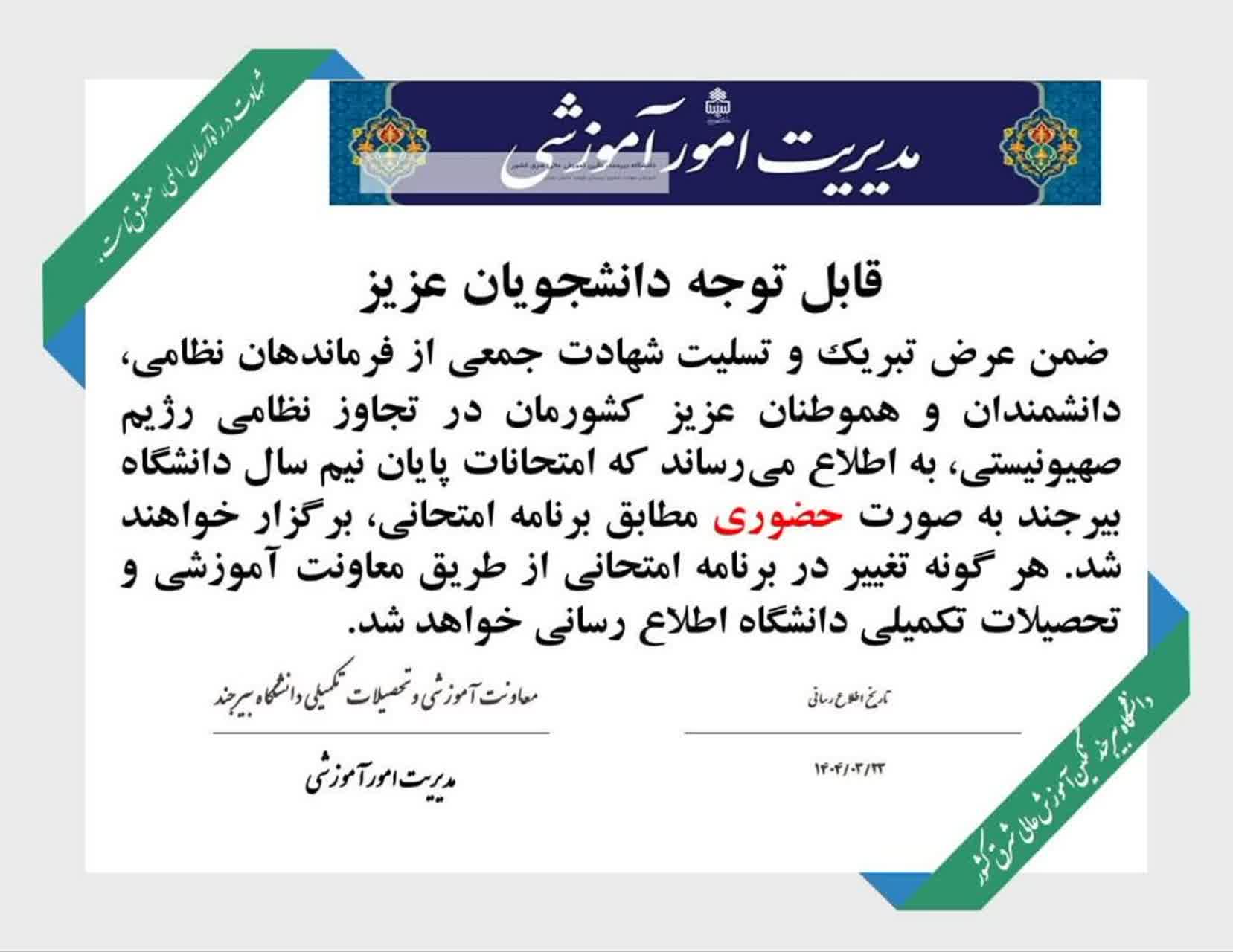 ضمن تبریک و تسلیت شهادت جمعی از فرماندهان نظامی، دانشمندان و هموطنان عزیز کشورمان در تجاوز نظامی رژیم صهیونیستی، به اطلاع میرساند که امتحانات پایان نیمسال دانشگاه بیرجند به صورت حضوری، مطابق برنامه امتحانی برگزار خواهد شد.