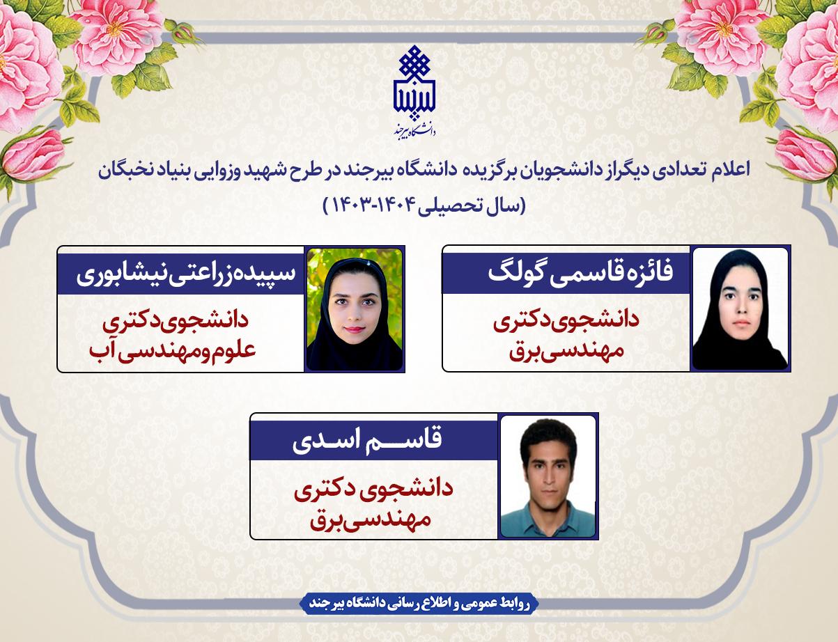 براساس اعلام این بنیاد اسامی سه دانشجویی دانشگاه بیرجند بهعنوان برگزیده نهایی این طرح معرفی شد.