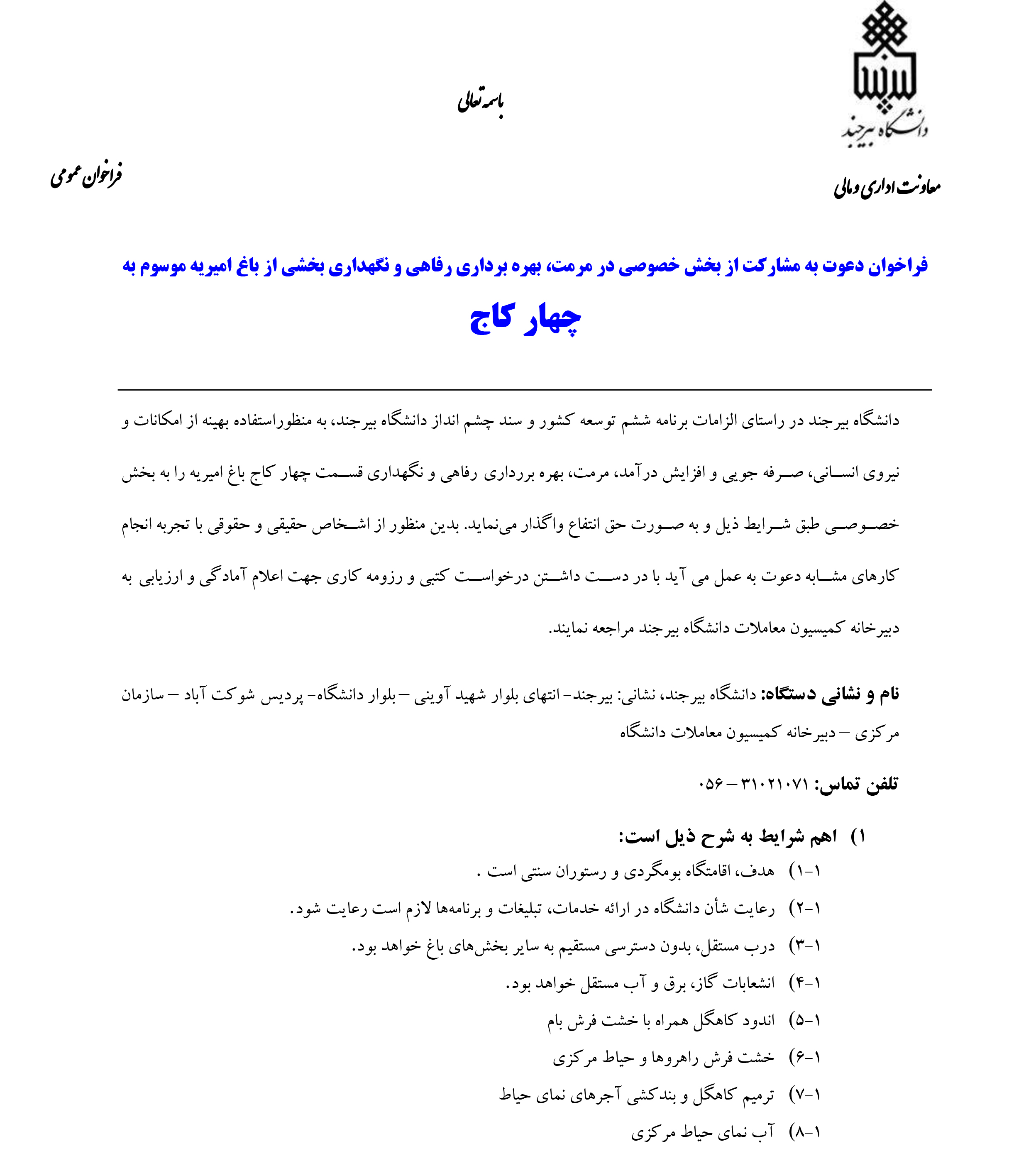 فراخوان دعوت به مشارکت از بخش خصوصی در مرمت، بهره برداری رفاهی و نگهداری بخشی از باغ امیریه موسوم به چهار کاج
