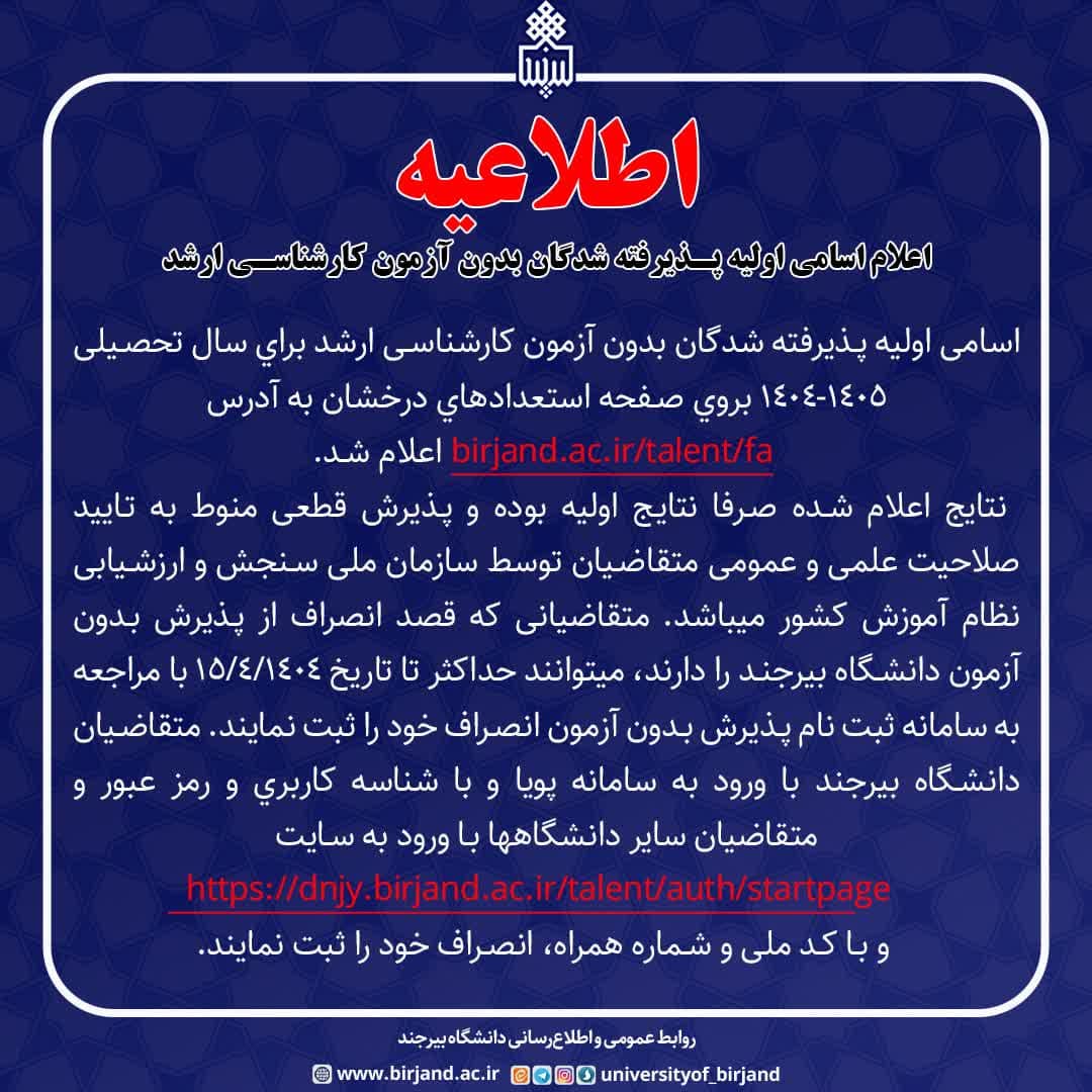اسامی اولیه پـذیرفته شدگان بدون آزمون کارشناسـی ارشد برای سال تحصـیلی 1405-1404 بروی صـفحه استعدادهای درخشان به آدرس birjand.ac.ir/talent/fa اعلام شـد.