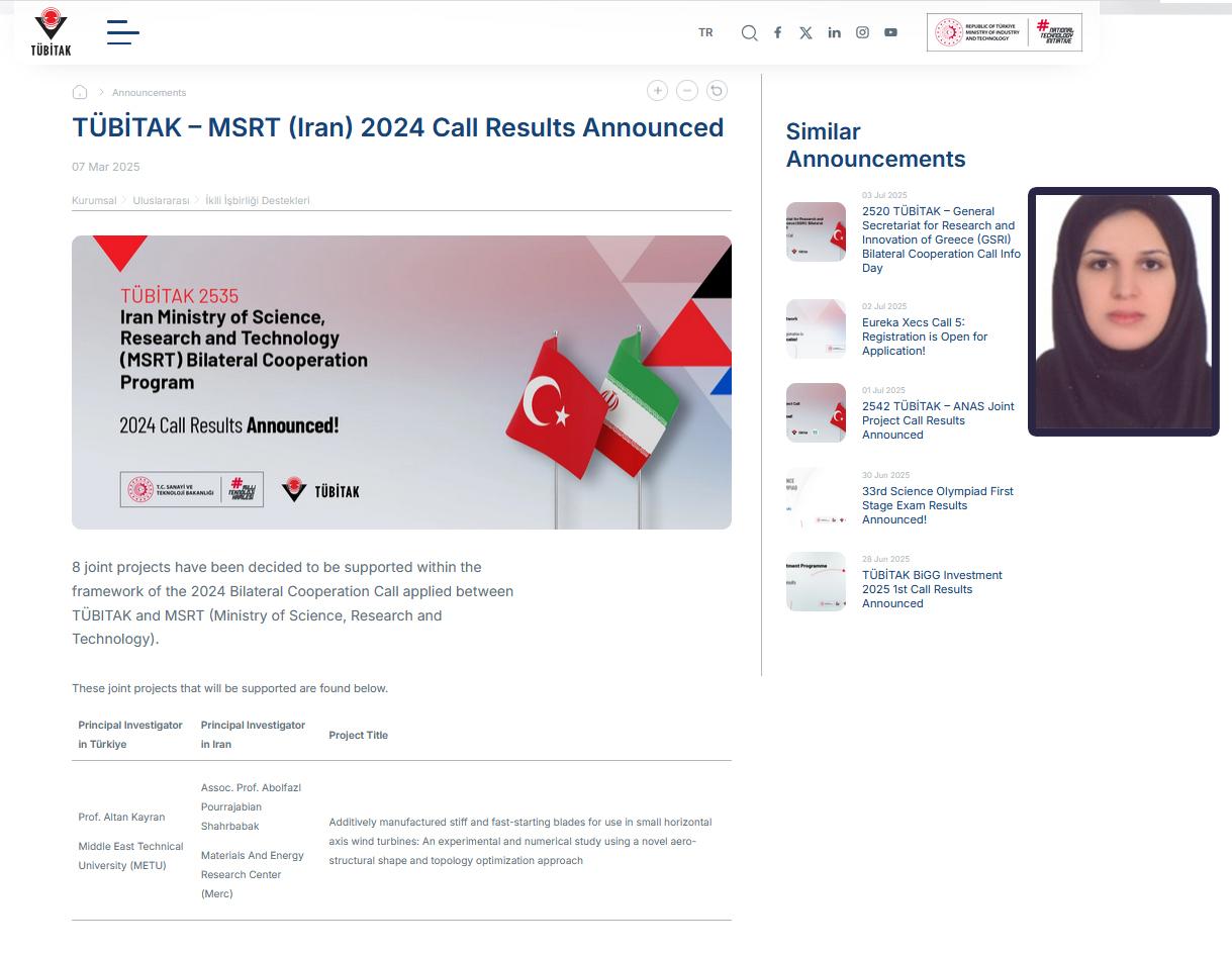 اطلاعات کامل پذیرش این طرح در فراخوان مشترک TUBITAK-MSRT سال ۲۰۲۴، از طریق لینک رسمی منتشر شده در وبسایت شورای تحقیقات علمی و فناوری ترکیه قابل دسترس است: