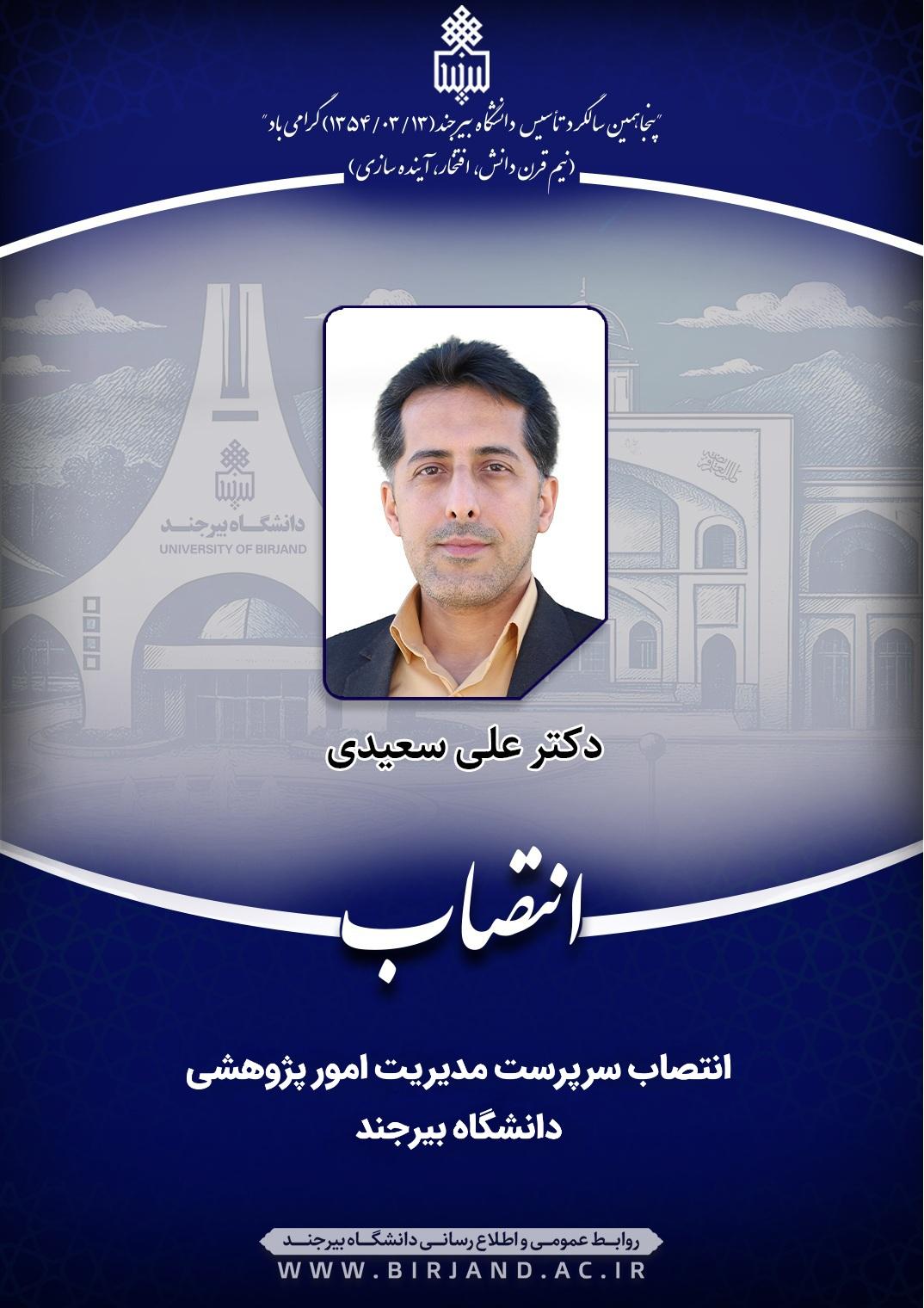 به گزارش روابط عمومی و اطلاعرسانی دانشگاه بیرجند، در متن ابلاغ انتصاب دکتر سعیدی آمده است؛ نظر به مراتب تعهد، تجـارب و شایسـتگیهای علمی و اجرایی جنابعالی، به موجب این ابلاغ و با حفظ سـمت آموزشـی و پژوهشی، به عنوان سرپرست مدیریت امور پژوهشی دانشگاه بیرجند منصوب میشوید.