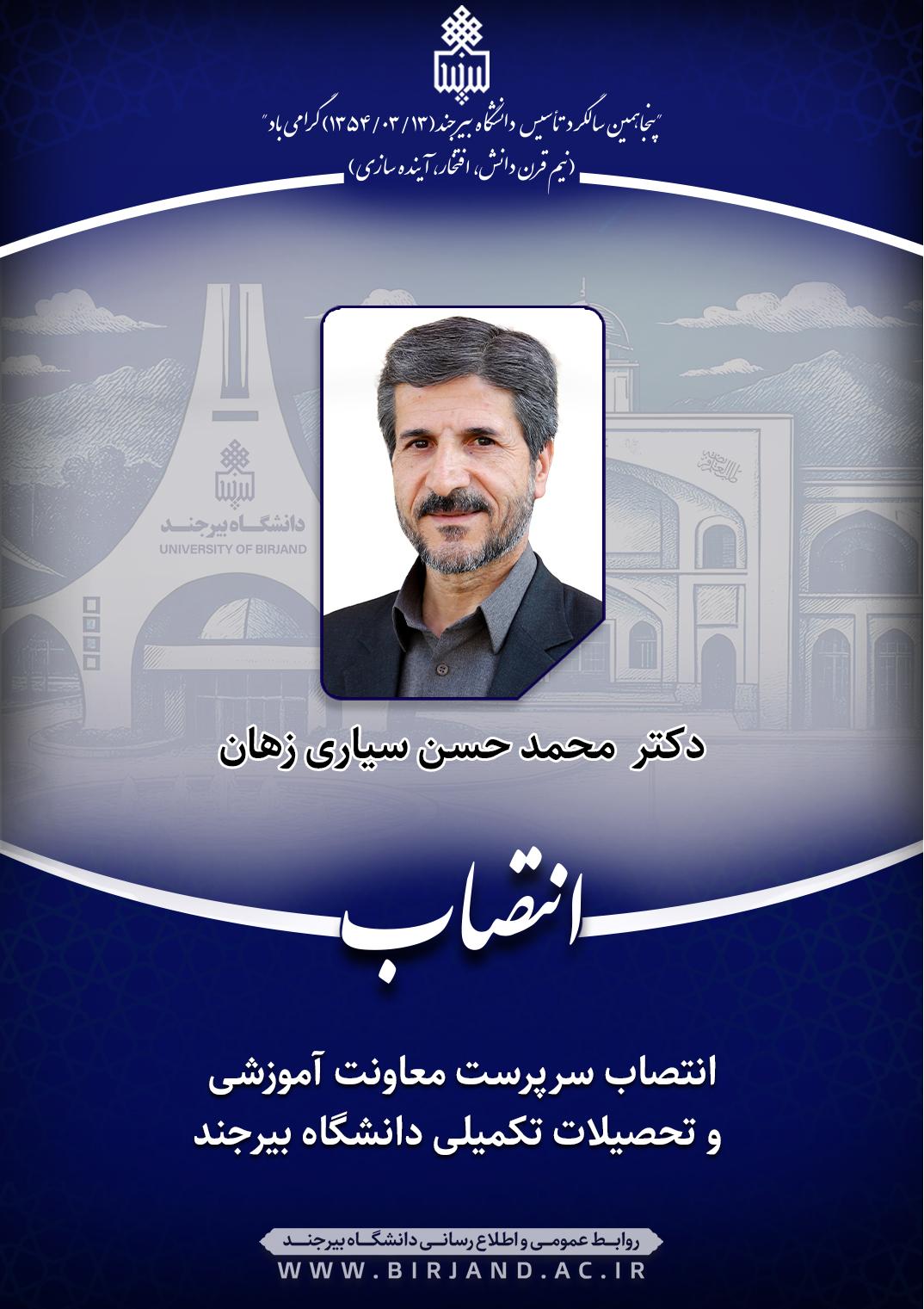 به گزارش روابط عمومی و اطلاعرسانی دانشگاه بیرجند، طی ابلاغی از سوی دکتر احمد خامسان، سرپرست دانشگاه، دکتر محمد حسن سیاری، عضو هیأت علمی گروه آموزشی مهندسی تولید و ژنتیک گیاهی به سمت سرپرست معاونت آموزشی و تحصیلات تکمیلی دانشگاه بیرجند منصوب شد.