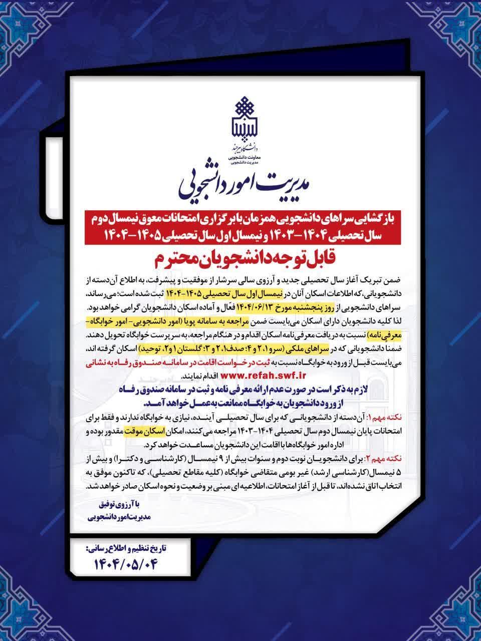 اطلاعیه بازگشایی سراهای دانشجویی همزمان بابرگزاری امتحانات معوق نیمسال دوم تحصیلی ۱۴۰۴-۱۴۰۳ ونیمسال اول سال تحصیلی ۱۴۰۵-۱۴۰۴