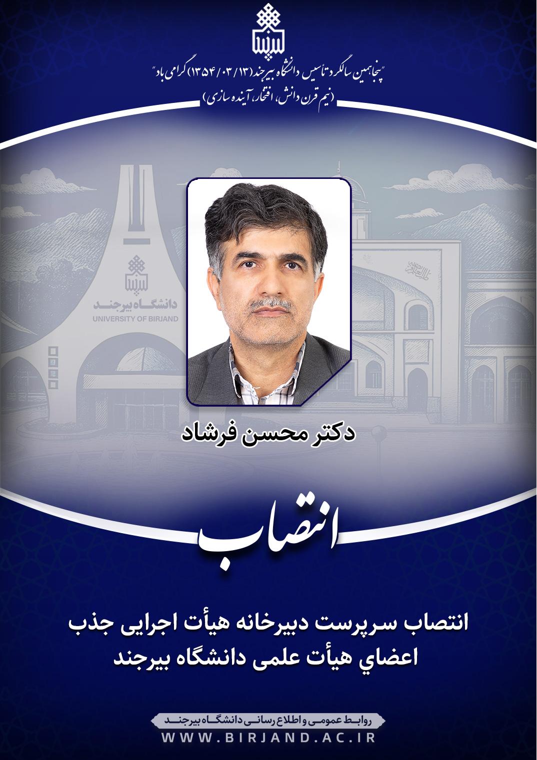 به گزارش روابط عمومی و اطلاعسانی دانشگاه بیرجند، در ابلاغ انتصاب دکتر فرشاد به سمت سرپرست دبیرخانه هیأت اجرایی جذب اعضای هیأت علمی دانشگاه، آمده است؛ نظر به مراتب تعهد، تجارب و شایستگیهای علمی و اجرایی جنابعالی، به موجب این ابلاغ و با حفظ سمت آموزشی و پژوهشی، به سمت «سـرپرست دبیرخانه هیأت اجرایی جذب اعضای هیأت علمی دانشگاه» منصوب میشوید. اطمینان دارم با اتکال به خداوند سبحان و بهرهگیری از مشارکت و همفکری همکاران دانشگاهی، منشاء خدمات ارزندهای در این حوزه خواهید بود.