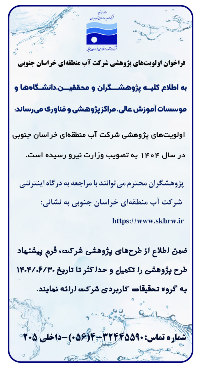 فراخوان اولویت های پژوهشی شرکت آب منطقهای استان خراسان جنوبی ۱۱ مرداد ۱۴۰۴ | ۱۲:۳۹ کد : ۳۱۵۳۰ اطلاعیه ها ارسال به دیگران نام شما ایمیل شما ایمیل دریافتکننده ارسال انصراف تعداد بازدید:۱۹۶۰