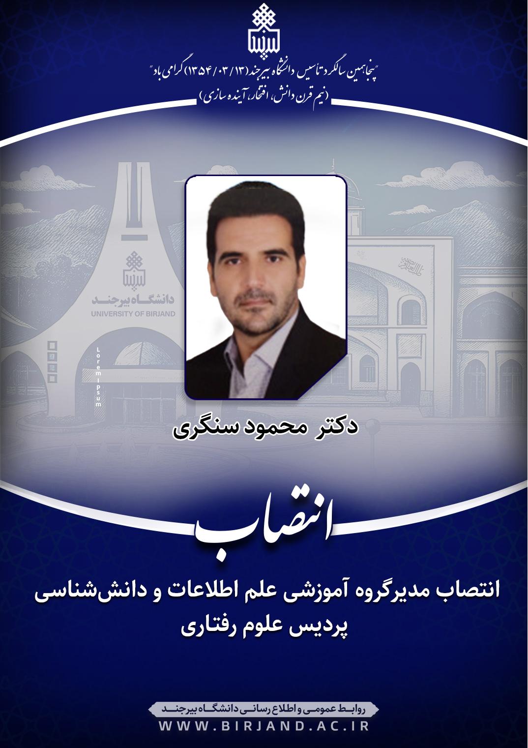 به گزارش روابط عمومی و اطلاعرسانی دانشگاه بیرجند، در ابلاغ انتصاب صادره از سوی سرپرست دانشگاه آمده است؛ نظر به مراتب تعهد، تجارب و شایستگیهای علمی و اجرایی جنابعالی، به پیشنهاد رئیس محترم پردیس علوم رفتاری به موجب این ابلاغ و با حفظ سمت آموزشی و پژوهشی، در سمت مدیرگروه آموزشی علم اطلاعات و دانششناسی پردیس علوم رفتـاری به مّدت دو سال منصوب میشوید.