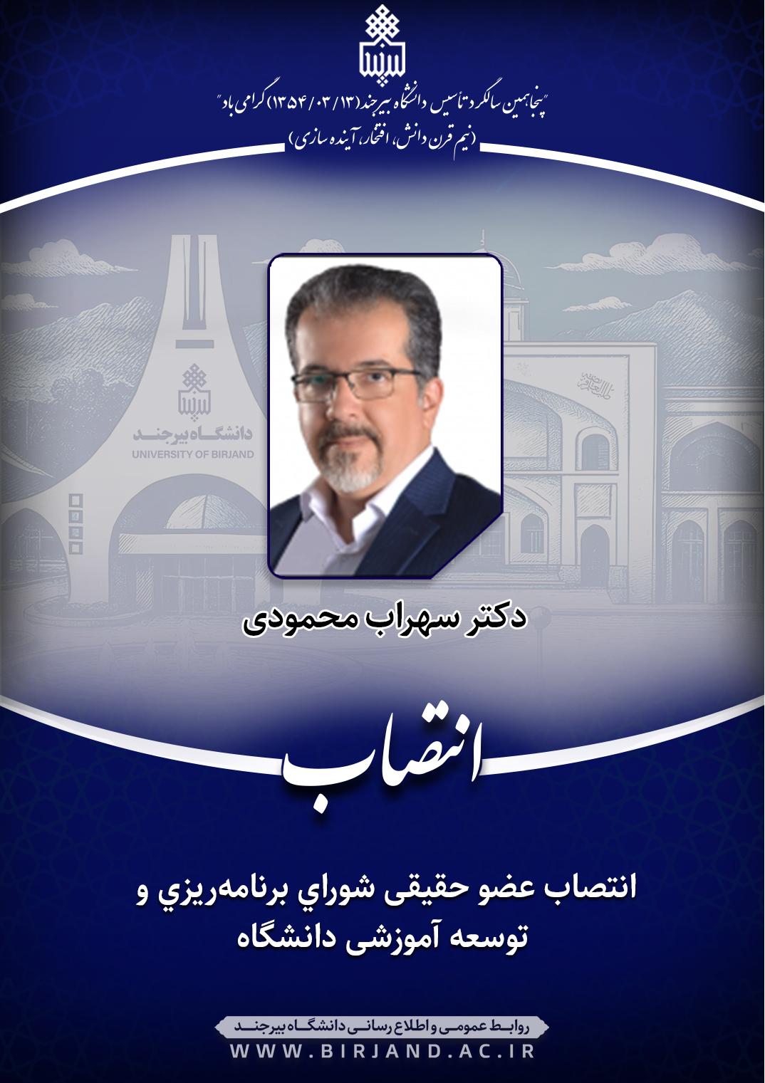 به گزارش روابط عمومی و اطلاعرسانی دانشگاه بیرجند، بنا به پیشنهاد معاون محترم آموزشی و تحصیلات تکمیلی دانشـگاه و نظر به مراتب تعهد، تجارب و شایستگیهای علمی جنابعالی، به موجب این ابلاغ به سمت عضو حقیقی شورای برنامهریزی و توسعه آموزشی دانشگاه به مدت دو سال منصوب میشوید. امید است با اتکال به خداوند سـبحان و بهرهگیری از مشارکت و همفکری سایر اعضا در راستای تحقق اهداف ومأموریتهای محوله (از جمله:بازنگری و هدایت رشـتههای تحصـیلی، به روزرسانی برنامههای درسی، و ایجاد نوآوریهای آموزشی در دانشگاه) موفق و مؤید باشید.