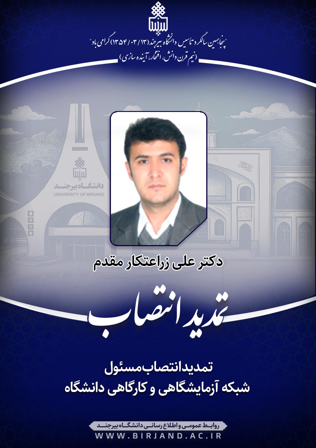 به گزارش روابط عمومی و اطلاعرسانی دانشگاه بیرجند، در ابلاغ تمدید انتصاب صادره از سوی دکتر خامسان به دکتر زراعتکارمقدم آمده است؛ نظر به مراتب تعهد، تجارب و شایسـتگیهای علمی و اجرایی جنابعالی و با تشکر از اقدامات و تلاشهای مستمر، مثمرثمر و ارزشمند شما، به موجب این ابلاغ و با حفظ سمت آموزشی و پژوهشی، انتصاب شما به سمت مسـئول شبکه آزمایشگاهی و کارگاهی دانشگاه به مدت دو سال تمدید میشود. اطمینـان دارم بـا اتکال به خداوند سـبحان و بهرهگیری از مشارکت و همفکری همکاران دانشـگاهی، منشاء خـدمات ارزنـدهای در این حوزه خواهید بود.