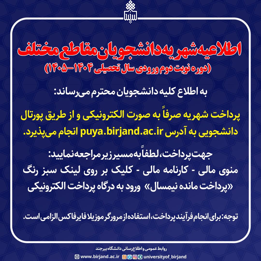 پرداخت شهریه صرفاً به صورت الکترونیکی و از طریق پورتال دانشجویی به آدرس puya.birjand.ac.ir انجام میپذیرد.