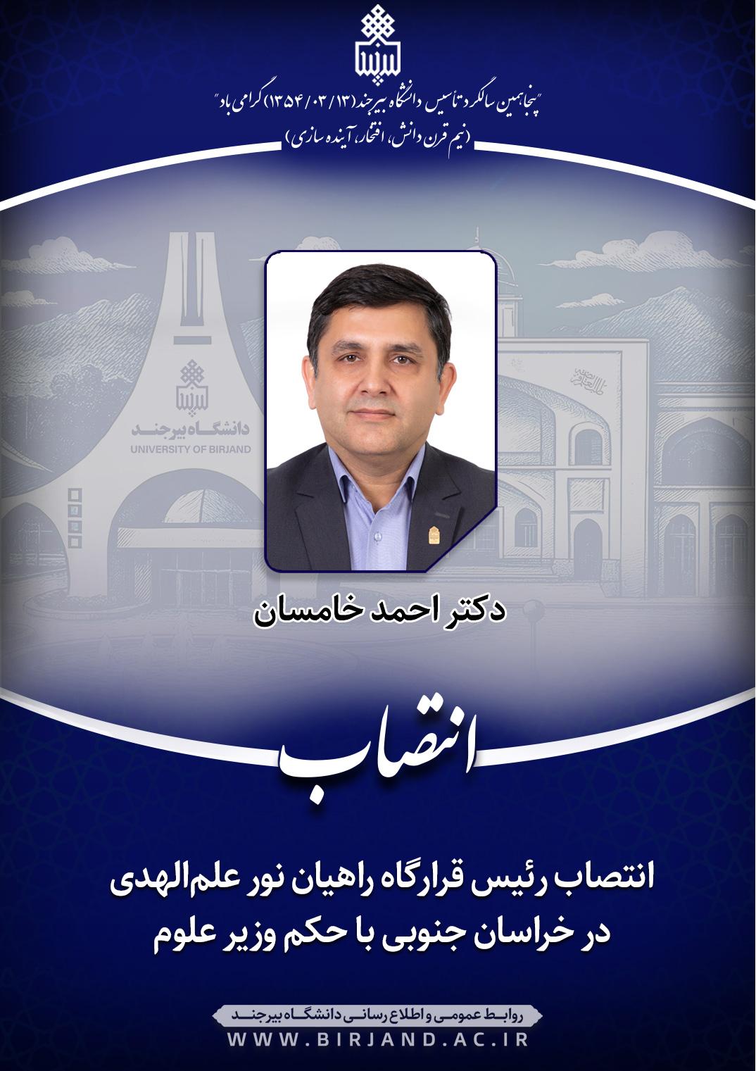 به گزارش روابط عمومی و اطلاعرسانی دانشگاه بیرجند، طی حکمی از سوی وزیر علوم، تحقیقات و فناوری، دکتر احمد خامسان، سرپرست دانشگاه بیرجند به سمت رئیس قرارگاه راهیان نور علمالهدی در استان خراسان جنوبی منصوب شد. این قرارگاه با مأموریتهایی مشخص در راستای گسترش فرهنگ ایثار و مقاومت در میان دانشجویان فعالیت خواهد کرد.