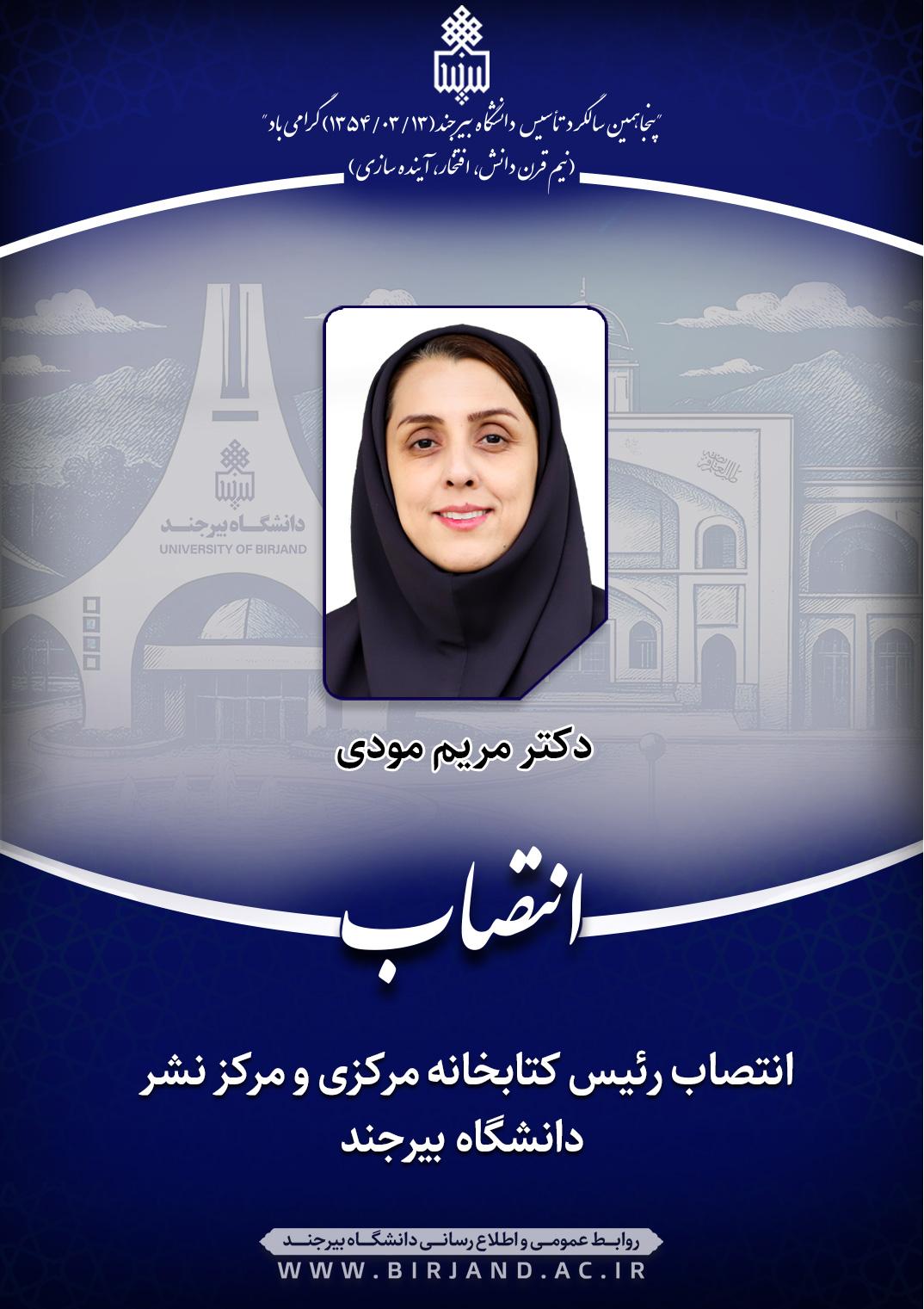به گزارش روابط عمومی و اطلاعرسانی دانشگاه بیرجند، در این ابلاغ انتصاب آمده است؛ نظر به مراتب تعهد، تجارب و شایستگیهای علمی و اجرایی سرکار عالی، به موجب این ابلاغ و با حفظ سمت آموزشی و پژوهشی، به عنوان رئیس کتابخانه مرکزی و مرکز نشر دانشگاه به مدت دو سال منصوب میشوید. امید است با اتکال به خداوند سبحان و بهرهگیری از مشارکت و همفکری همکاران دانشگاهی در راستای تحقق اهداف و مأموریتهای محوله (از جمله: تهیه و تنظیم دستورالعملهای مربوط به استفاده کاربران از خدمات کتابخانه، تلاش در راستای بهبود مستمر فعالیتها و فرآیندها و ارتقاء سطح مهارت و توانمندی کارکنان مجموعه ذیربط، برنامهریزی و اقدام در امر تهیه کتب درسی و کمکدرسی و نشریات مورد نیاز گروههای آموزشی، ایجاد و فعالسازی بانکهای اطلاعاتی مورد نیاز، ارزیابی نظرات مراجعین و استفاده از آن در تعیین خطمشی برنامههای سالانه و تقویم اجرایی ذیربط، مدیریت امور مربوط به چاپ و انتشارات دانشگاه، و برقراری ارتباط با مجامع علمی و کتابخانهها و مراکز نشر داخلی و خارجی بهمنظور ایجاد سیستم منظم و کارآمد کتابداری) موفق و مؤید باشید.