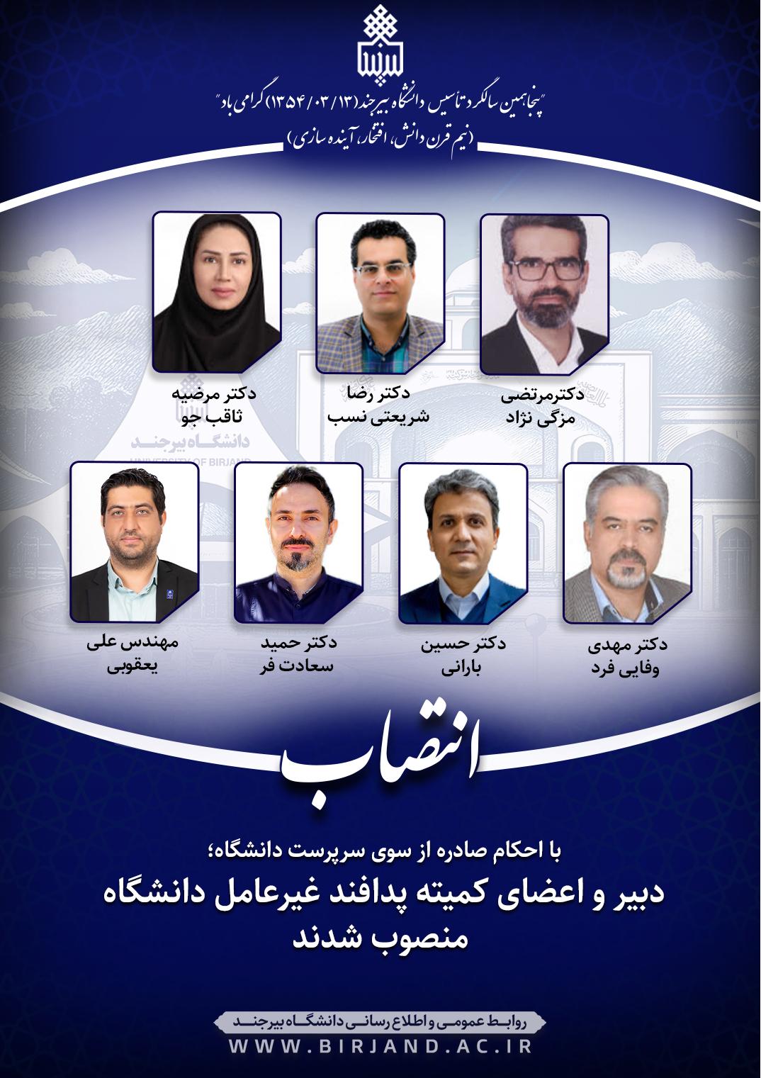 به گزارش روابط عمومی و اطلاعرسانی دانشگاه بیرجند، براساس احکام صادره از سوی سرپرست دانشگاه، دکتر مرتضی مزگینژاد، به عنوان دبیر و دکتر رضا شریعتی نسب، معاون اداری و مالی، دکتر مهدی وفائیفرد، سرپرست معاونت فرهنگی و اجتماعی،دکتر مرضیه ثاقب جو، سرپرست معاونت پژوهش، فناوری و نوآوری و دکتر حسین بارانی، معاون دانشجویی، دکتر حمید سعادت فر، مدیر توسعه فناوری اطلاعات، امنیت و هوشمندسازی و مهندس علی یعقوبی، مدیر امور فنی و نظارت بر طرح های عمرانی به مدت دوسال به عنوان اعضای کمیته پدافند غیرعامل دانشگاه منصوب شدند.