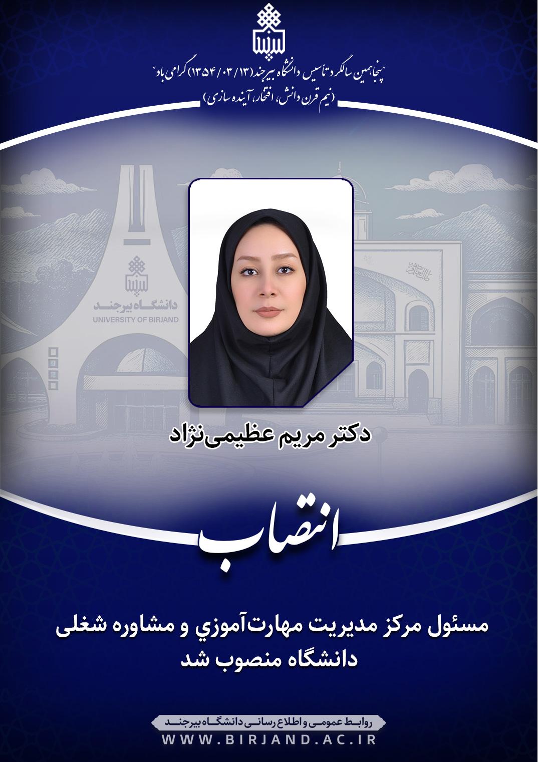 به گزارش روابط عمومی و اطلاعرسانی دانشگاه بیرجند، در ابلاغ انتصاب صادره از سوی سرپرست دانشگاه به دکتر عظیمینژاد آمده است؛ نظر به مراتب تعهـد، تجـارب و شایسـتگیهای علمی و اجرایی سـرکارعالی و به پیشـنهاد سـرپرست معـاونت محترم پژوهش، فناوری و نوآوری دانشـگاه، به مـوجب این ابلاغ و بـا حفظ سمت آموزشی و پژوهشی، به عنوان مسئول مرکز مدیریت مهارتآموزی و مشاوره شغلی دانشگاه، به مدت دو سال منصوب میشویـد.