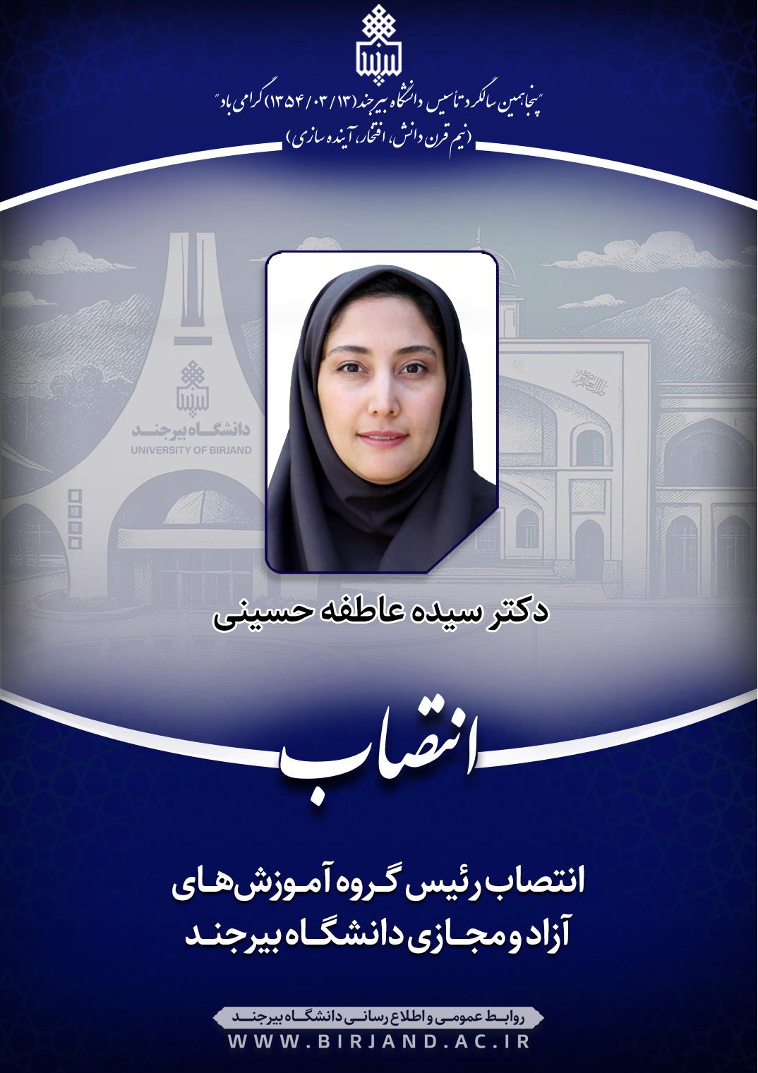 به گزارش روابط عمومی و اطلاعرسانی دانشگاه بیرجند، در متن ابلاغ انتصاب دکتر سیده عاطفه حسینی به سمت رئیس گروه آموزشهای آزاد و مجازی دانشگاه بیرجند آمده است؛ نظر به مراتب تعهـد، تجارب و شایسـتگیهای علمی و اجرایی سرکارعالی، به موجب این ابلاغ و با حفظ سمت آموزشی و پژوهشـی، به مـدت دو سال به عنوان رئیس گروه آموزشهـای آزاد و مجـازی دانشـگاه منصوب میشویـد. اطمینـان دارم بـا اتکال به خداوند سبحان و بهرهگیری از مشـارکت و همفکری همکاران دانشگاهی، منشاء خدمات ارزندهای خواهید بود.