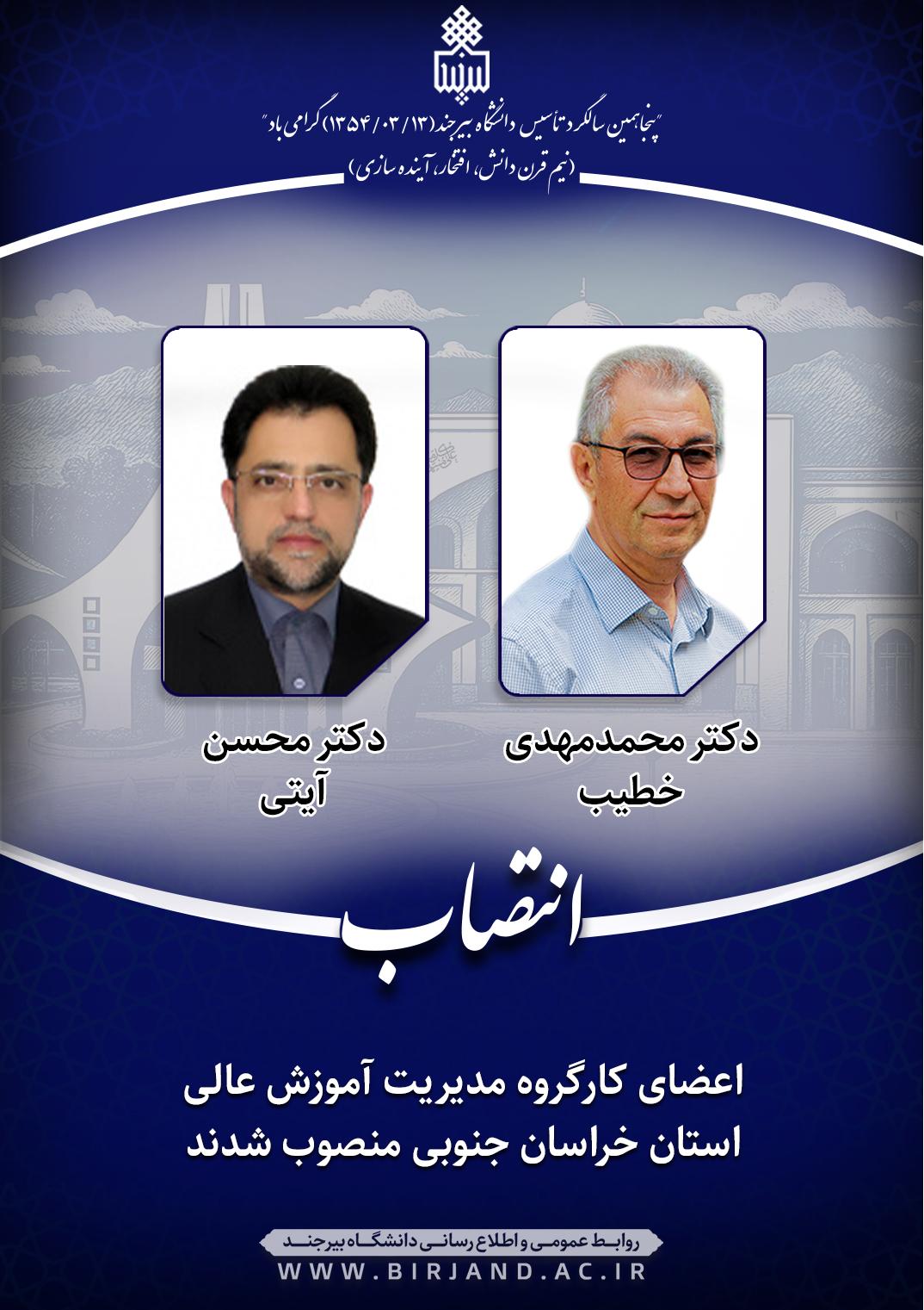 به گزارش روابط عمومی و اطلاعرسانی دانشگاه بیرجند، دکتر احمد خامسان، سرپرست دانشگاه طی ابلاغهای جداگانهای، دکتر محمدمهدی خطیب، عضو هیأت علمی گروه آموزشی زمین شناسی و دکتر محسن آیتی، هیأت علمی گروه آموزشی علوم تربیتی را به عنوان عضو کارگروه مدیریت آموزش عالی استان خراسان جنوبی به مدت دو سال منصوب کرد.