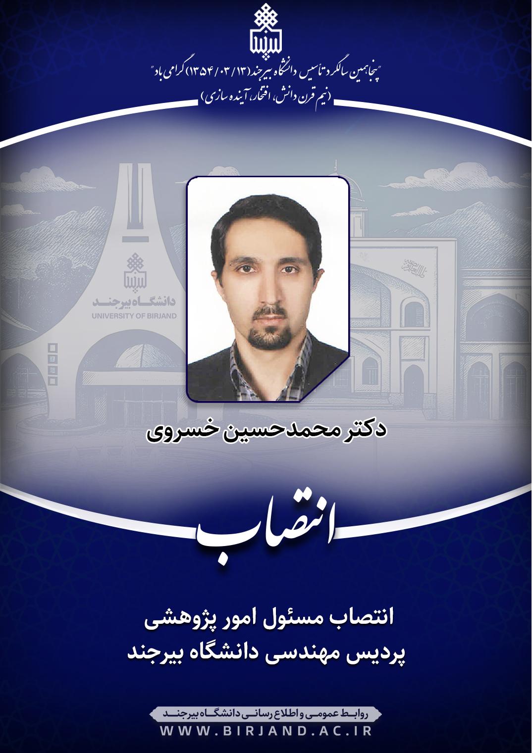 به گزارش روابط عمومی و اطلاع‌رسانی دانشگاه بیرجند، دکتر محمدحسین خسروی، عضو هیأت علمی گروه آموزشی مهندسی معدن، بنا به پیشنهاد رئیس پردیس مهندسی و با تأیید معاون پژوهش، فناوری و نوآوری دانشگاه، با حفظ سمت آموزشی و پژوهشی، به مدت دو سال به‌عنوان مسئول امور پژوهشی پردیس مهندسی منصوب شد.