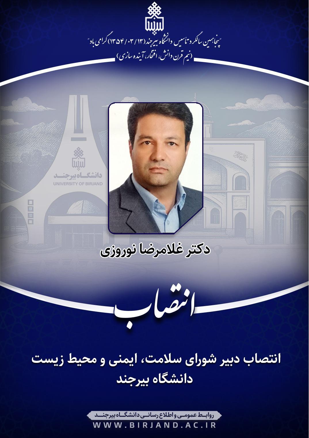 به گزارش روابط عمومی و اطلاعرسانی دانشگاه بیرجند، بر اساس ابلاغ صادره و با توجه به اهمیت موضوع سلامت، ایمنی و محیط زیست در محیطهای مختلف دانشگاه، غلامرضا نوروزی استادیار گروه معدن دانشکده مهندسی، به استناد ماده (۲) آییننامه اجرایی داخلی شورای سلامت، ایمنی و محیط زیست دانشگاه (مصوب صورتجلسه هیأت رئیسه دانشگاه به تاریخ ۱۳۹۸/۱۲/۲۱)، به عنوان دبیر این شورا منصوب شد.