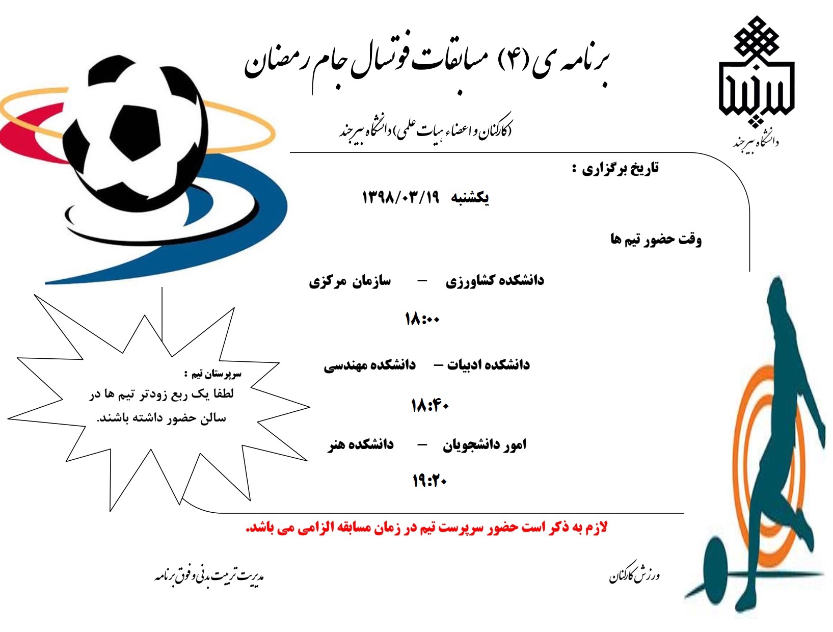 برنامه مسابقات فوتسال کارکنان و اعضا هیات علمی (جام رمضان) ۱۸ خرداد ۱۳۹۸ | ۱۴:۵۸ کد : ۳۵۹۷ اطلاعیه ها ارسال به دیگران نام شما ایمیل شما ایمیل دریافتکننده ارسال انصراف تعداد بازدید:۷۵۳۵