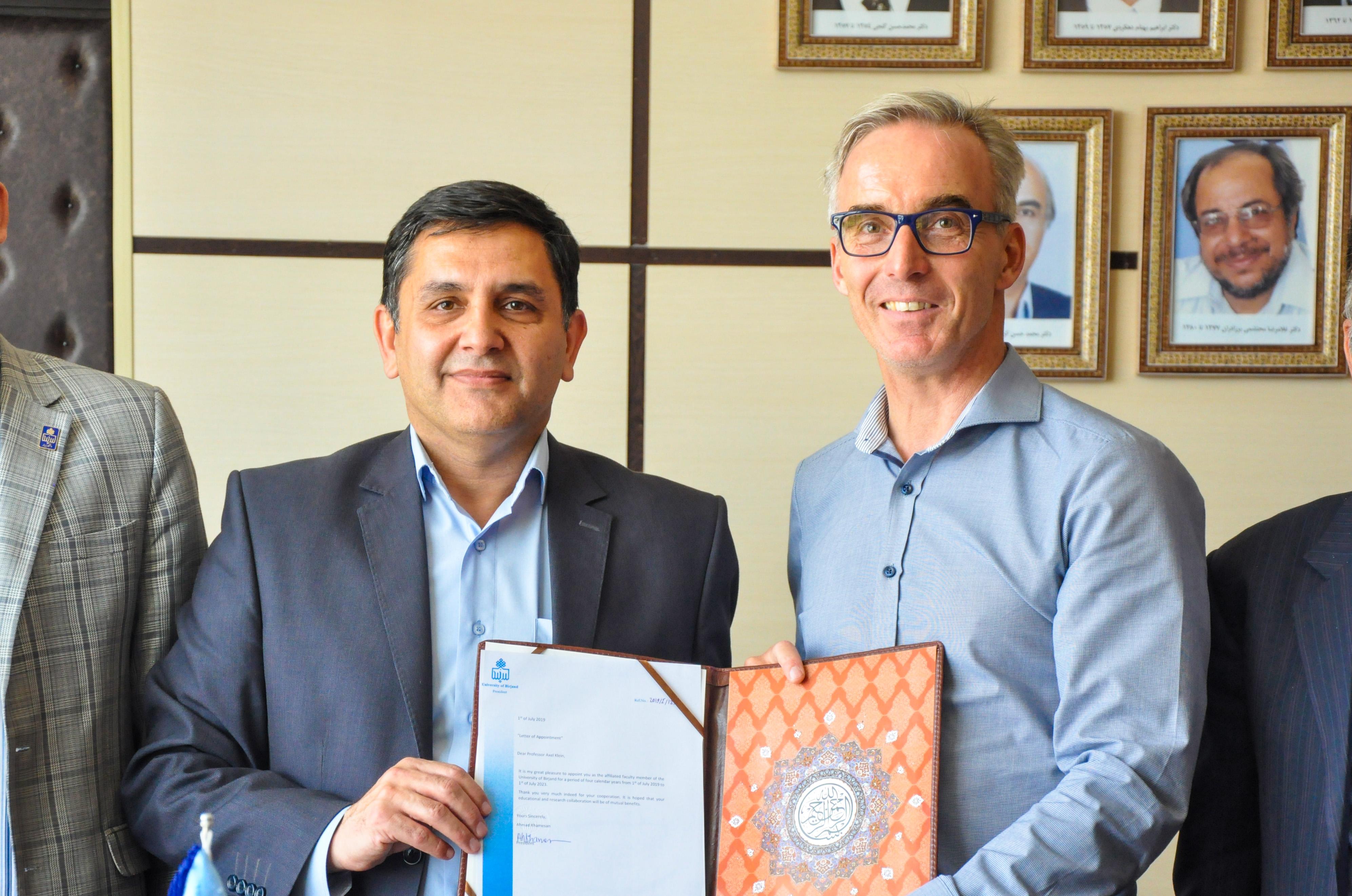 طی حکمی از طرف دکتر احمد خامسان رئیس دانشگاه بیرجند پروفسور اکسل کلاین استاد تمام دانشگاه کلن کشور آلمان به عنوان عضو هیات علمی وابسته دانشگاه بیرجند منصوب شد.