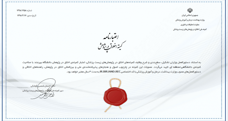 لازم به ذکر است دانشگاه بیرجند از معدود دانشگاههای تابعه وزارت علوم، تحقیقات و فناوری است که مجوز تاسیس کمیته اخلاق در پژوهش را اخذ نموده است.