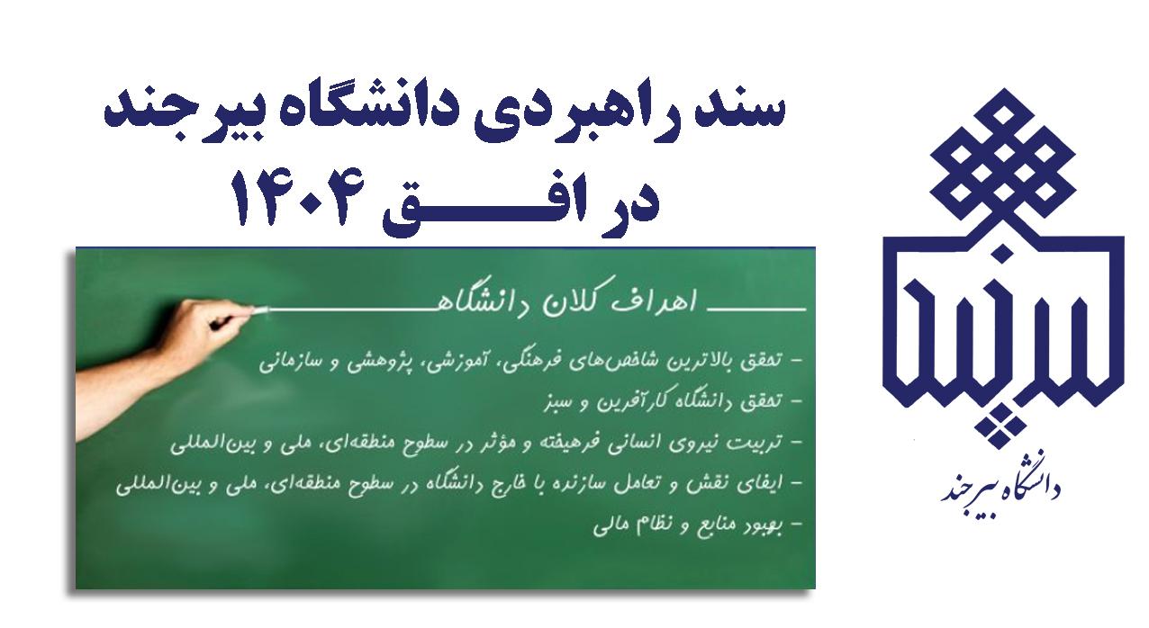 "دانشگاه بیرجند در افق 1404، مرجع برتر شرق کشور در تولید علم، تربیت نیروی انسانی و حل مسایل جامعه، جزو 20 دانشگاه ممتاز ایران و 1000 دانشگاه برتر جهان است."