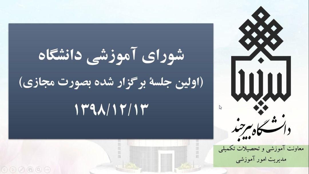 به گزارش روابط عمومی دانشگاه بیرجند، اولین تجربه در برگزاری جلسات شورای آموزشی بصورت مجازی، با همکاری کلیه اعضای شورا و با هدف به حداقل رساندن مخاطرات ناشی از سرایت احتمالی ویروس کرونا، در بستر شبکه اینترنت امروز سه شنبه ۱۳ اسفند ۱۳۹۸ برگزار گردید.