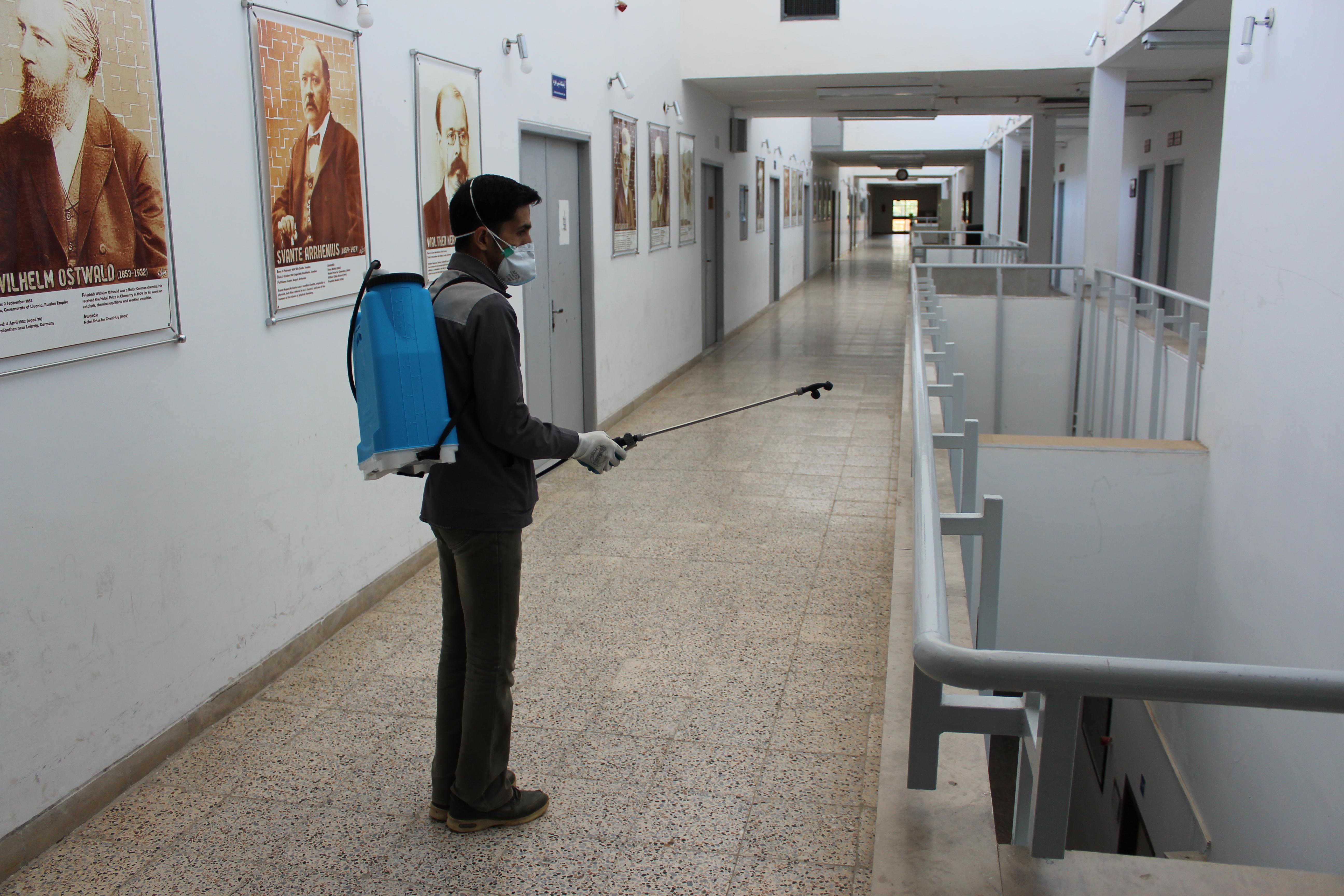 به گزارش مدیریت روابط عمومی و اطلاعرسانی دانشگاه بیرجند، در راستای مراقبت، مقابله و پیشگیری از شیوع ویروس کرونا و رعایت نکات بهداشتی طبق دستورالعمل ستاد مقابله با ویروس کرونا در دانشگاه بیرجند، صبح امروز سه شنبه 20 اسفند 98 کلیه سطوح ساختمان پردیس علوم پایه از قبیل اتاق ها، پله ها، کلاس های آموزشی، آسانسور، سرویس های بهداشتی و دستگاه خودپرداز توسط نیروهای خدمات پردیس علوم پایه گندزدایی و ضدعفونی شد.
