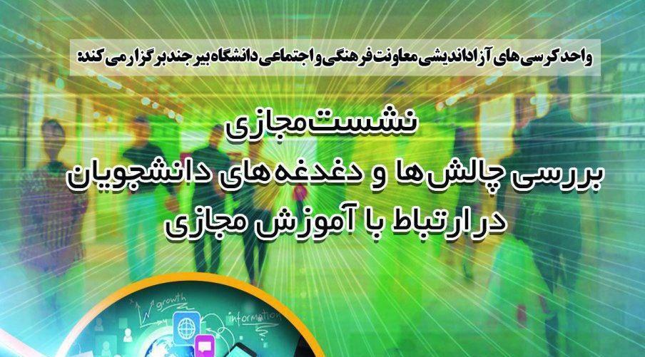 به گزارش روابط عمومی و اطلاعرسانی دانشگاه بیرجند، کرسی آزاداندیشی با موضوع بررسی چالشها و دغدغههای دانشجویان در ارتباط با آموزش مجازی شامگاه روز دوشنبه مورخ 2 اردیبهشت 1399 با حضوردکترآیتی، معاون آموزشی و تحصیلات تکمیلی، دکتر زنگویی، معاون فرهنگی و اجتماعی دانشگاه از طریق سامانه آموزش الکترونیکی دانشگاه(lms) به صورت حضوری برگزار شد.