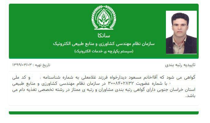 براساس اعلام سازمان نظام مهندسی کشاورزی و منابع طبیعی در سیستم یکپارچه خدمات الکترونیک، وی به عنوان عضو سازمان نظام مهندسی کشاورزی و منابع طبیعی خراسان جنوبی دارای گواهی رتبهبندی مشاوران و رتبه ممتاز در رشته تخصصی تغذیه دام است.