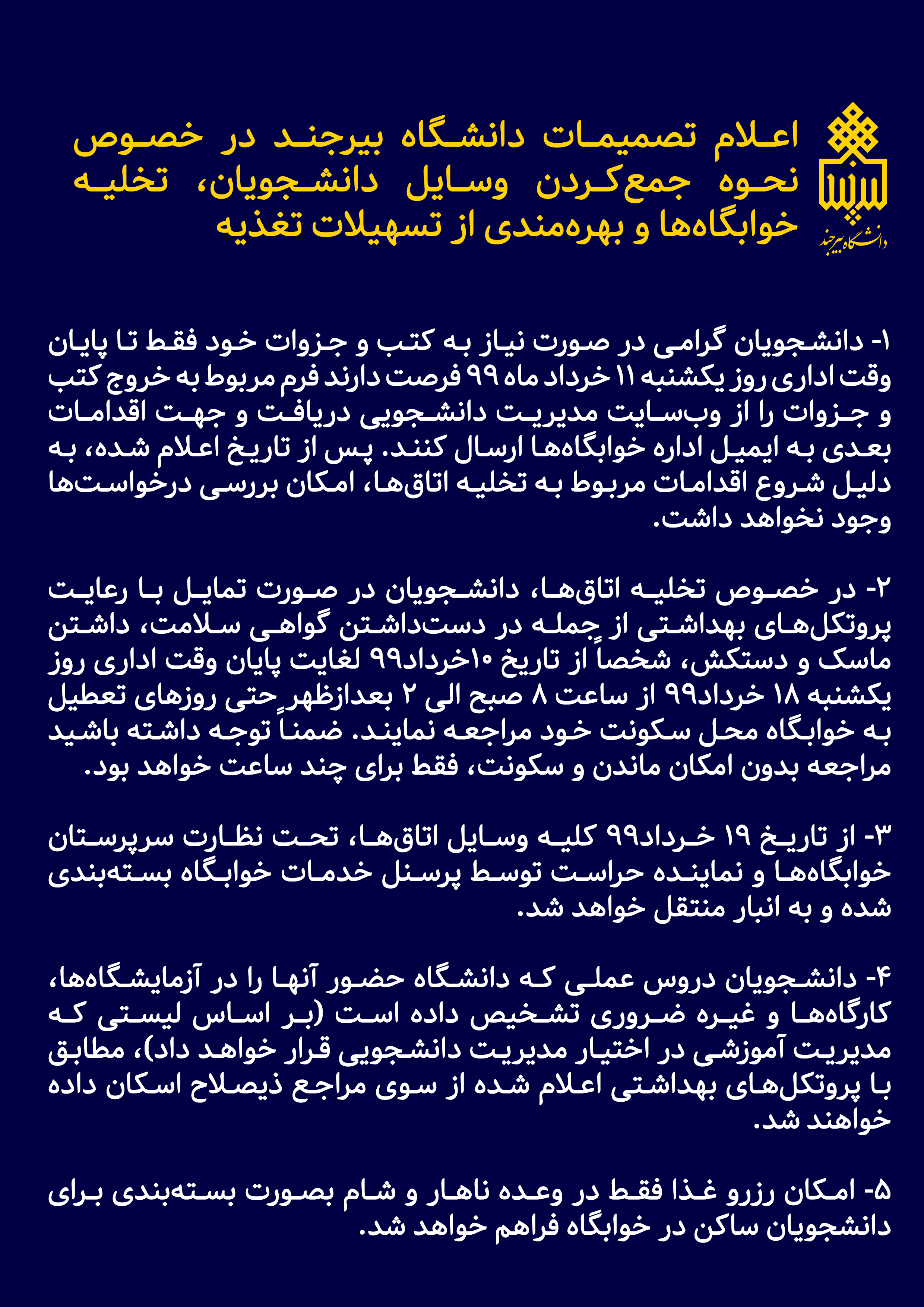 تصمیمات دانشگاه بیرجند در خصوص نحوه جمعکردن وسایل دانشجویان، تخلیه خوابگاهها و بهرهمندی از تسهیلات تغذیه ۰۷ خرداد ۱۳۹۹ | ۱۲:۰۶ کد : ۸۱۴۳ اطلاعیه ها ارسال به دیگران نام شما ایمیل شما ایمیل دریافتکننده ارسال انصراف تعداد بازدید:۱۲۷۸۰