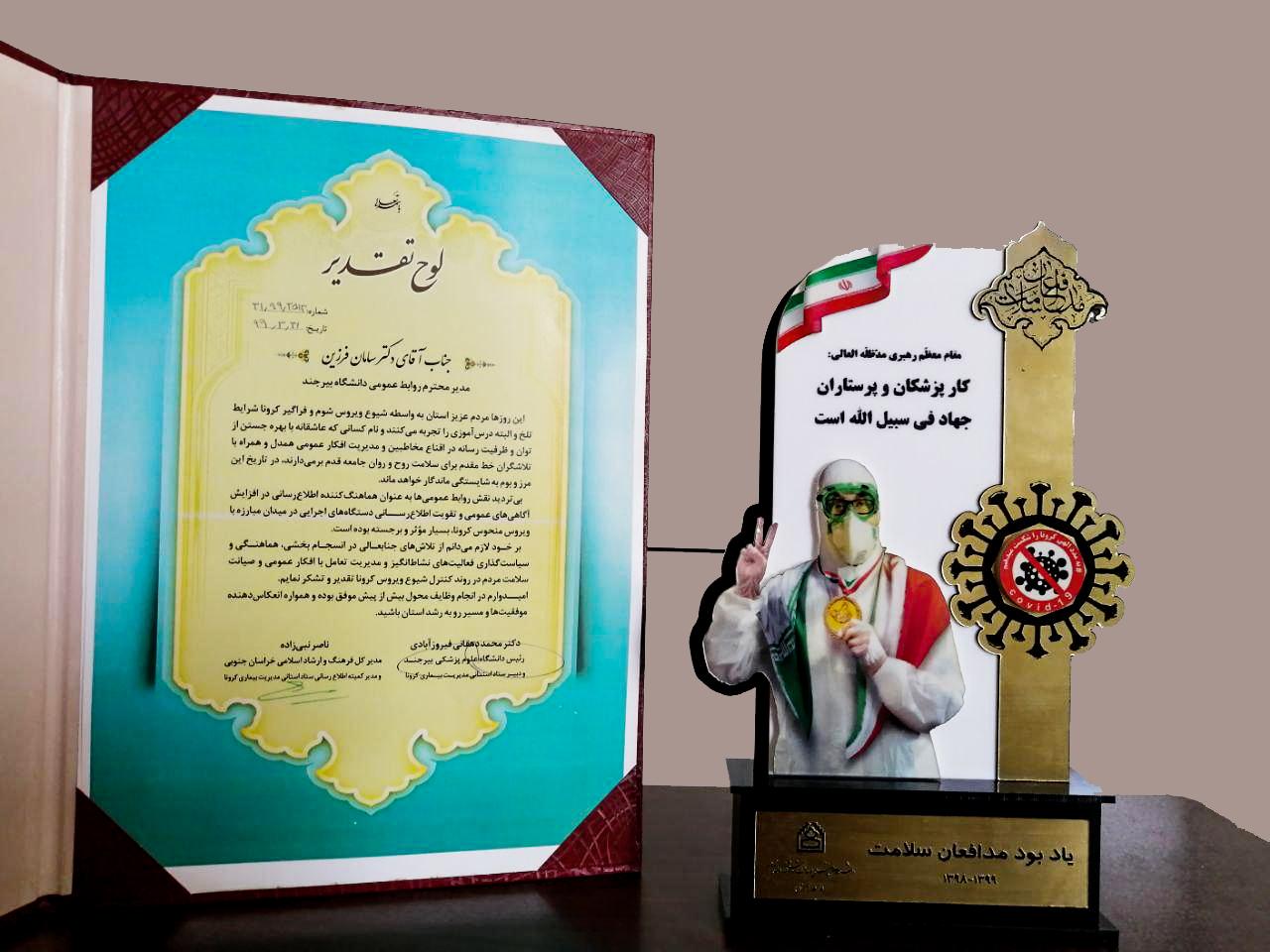 در بخشی از لوح تقدیر اهدایی به مدیر روابط عمومی و اطلاعرسانی دانشگاه بیرجند آمده است؛ این روزها مردم عزیز استان به واسطه شیوع ویروس شوم و فراگیر کرونا شرایط تلخ و البته درس آموزی را تجربه میکنند و نام کسانی که عاشقانه با بهره جستن از توان و ظرفیت رسانه در اقناع مخاطبین و مدیریت افکار عمومی همدل و همراه با تلاشگران خط مقدم برای سلامت روح و روان جامعه قدم برمیدارند، در تاریخ این مرز و بوم به شایستگی ماندگار خواهند ماند. بیتردید نقش روابط عمومیها بهعنوان هماهنگ کننده اطلاعرسانی در افزایش آگاهیهای عمومی و تقویت اطلاعرسانی دستگاههای اجرایی در میدان مبارزه با ویروس منحوس کرونا، بسیار مؤثر و برجسته بوده است.