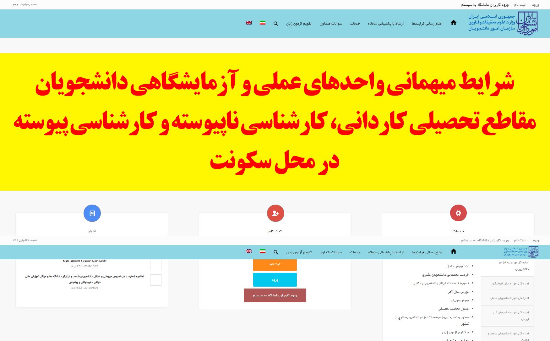 1ـ زمان ثبتنام متقاضیان میهمانی دروس عملی و کارگاهی در مقاطع کاردانی، کارشناسی ناپیوسته و کارشناسی پیوسته برای نیمسال اول سال تحصیلی 1400-1399 از طریق سامانه سجاد به آدرس https://portal.saorg.ir از تاریخ 06/05/1399 لغایت 18/05/1399 میباشد.
