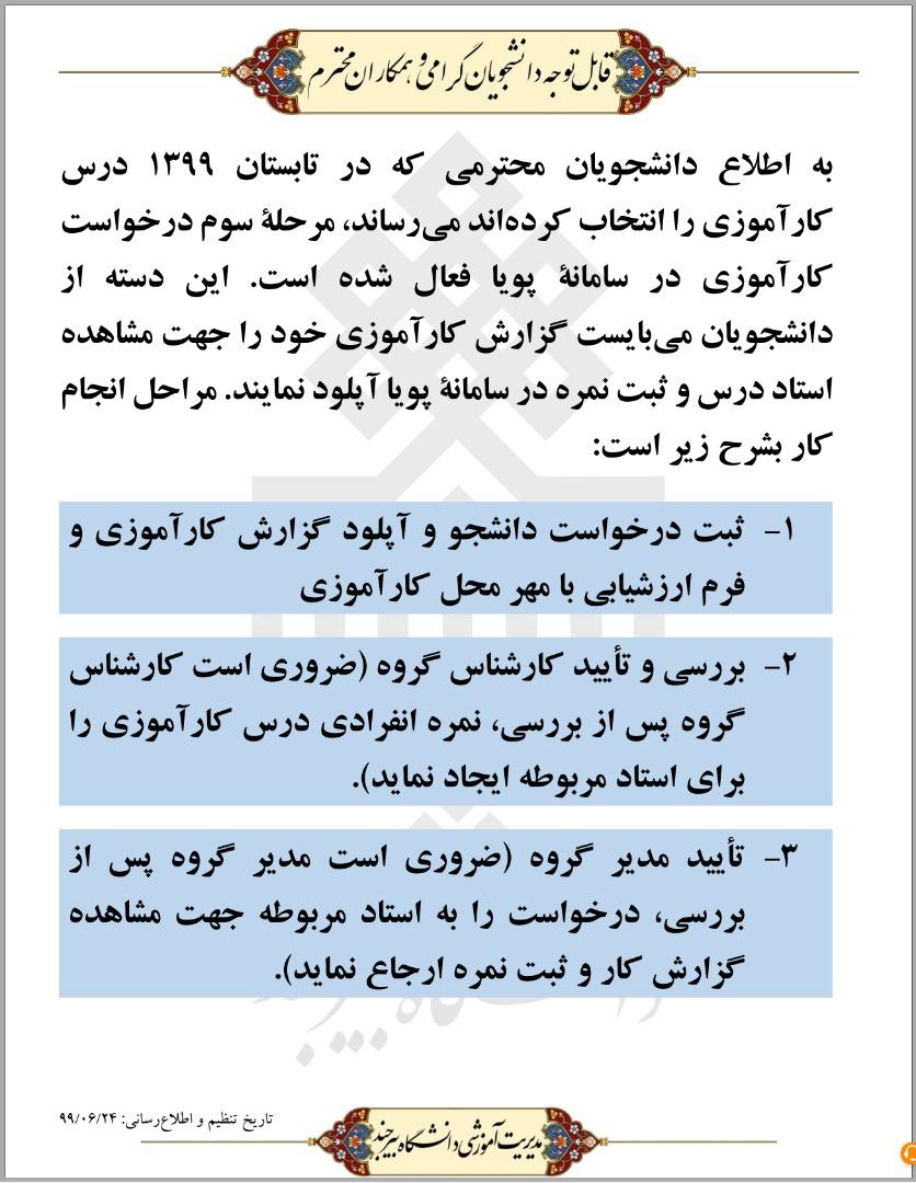 فعال شدن امکان بارگذاری گزارش کارآموزی در سامانه پویا ۲۵ شهریور ۱۳۹۹ | ۰۸:۱۰ کد : ۹۸۱۳ اطلاعیه ها اطلاعیه دانشجویی ارسال به دیگران نام شما ایمیل شما ایمیل دریافتکننده ارسال انصراف تعداد بازدید:۹۵۸۰ جهت مشاهد راهنمای تصویری درخواست کارآموزی- مرحلۀ سوم اینجا کلیک کنید.